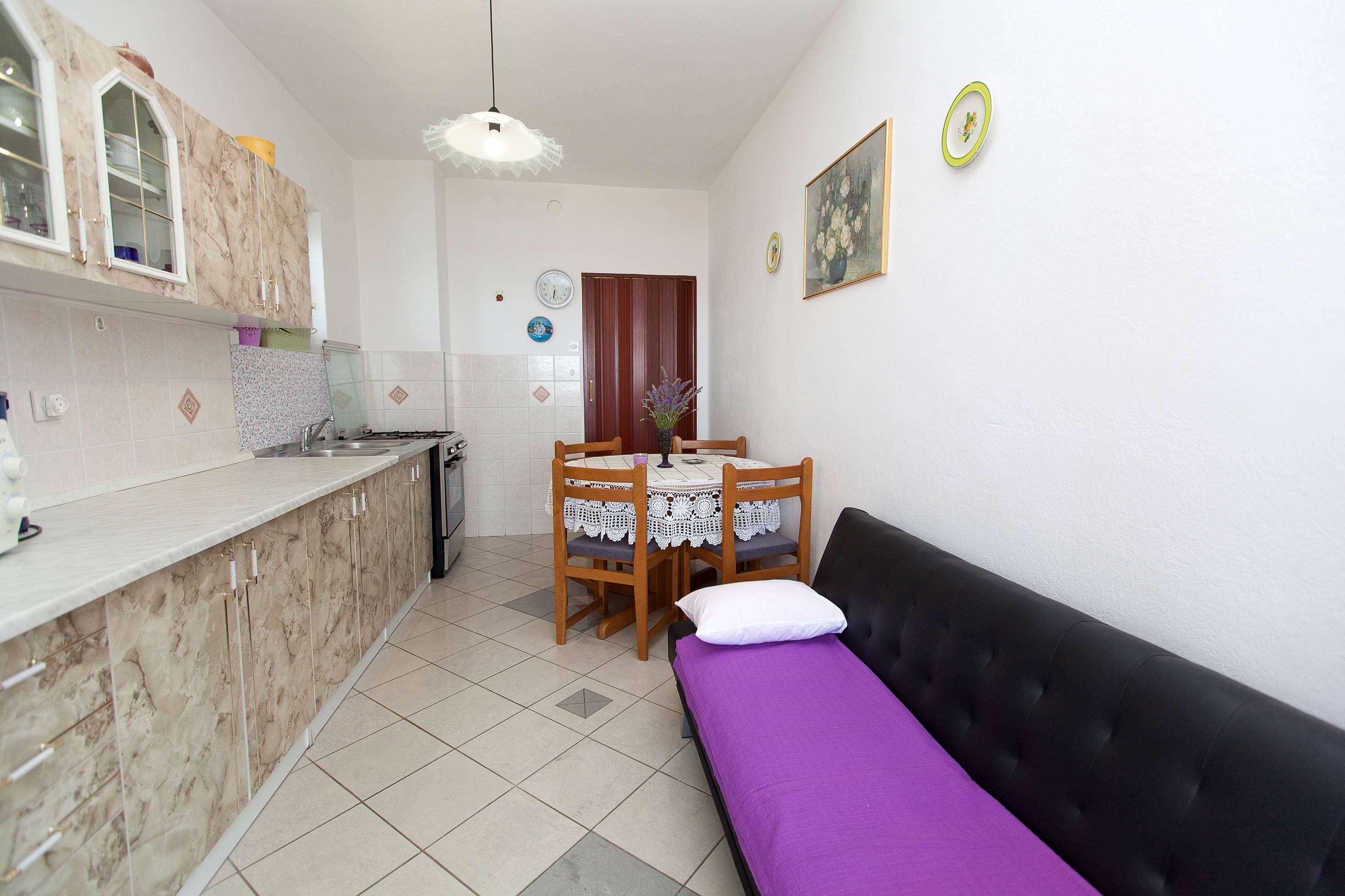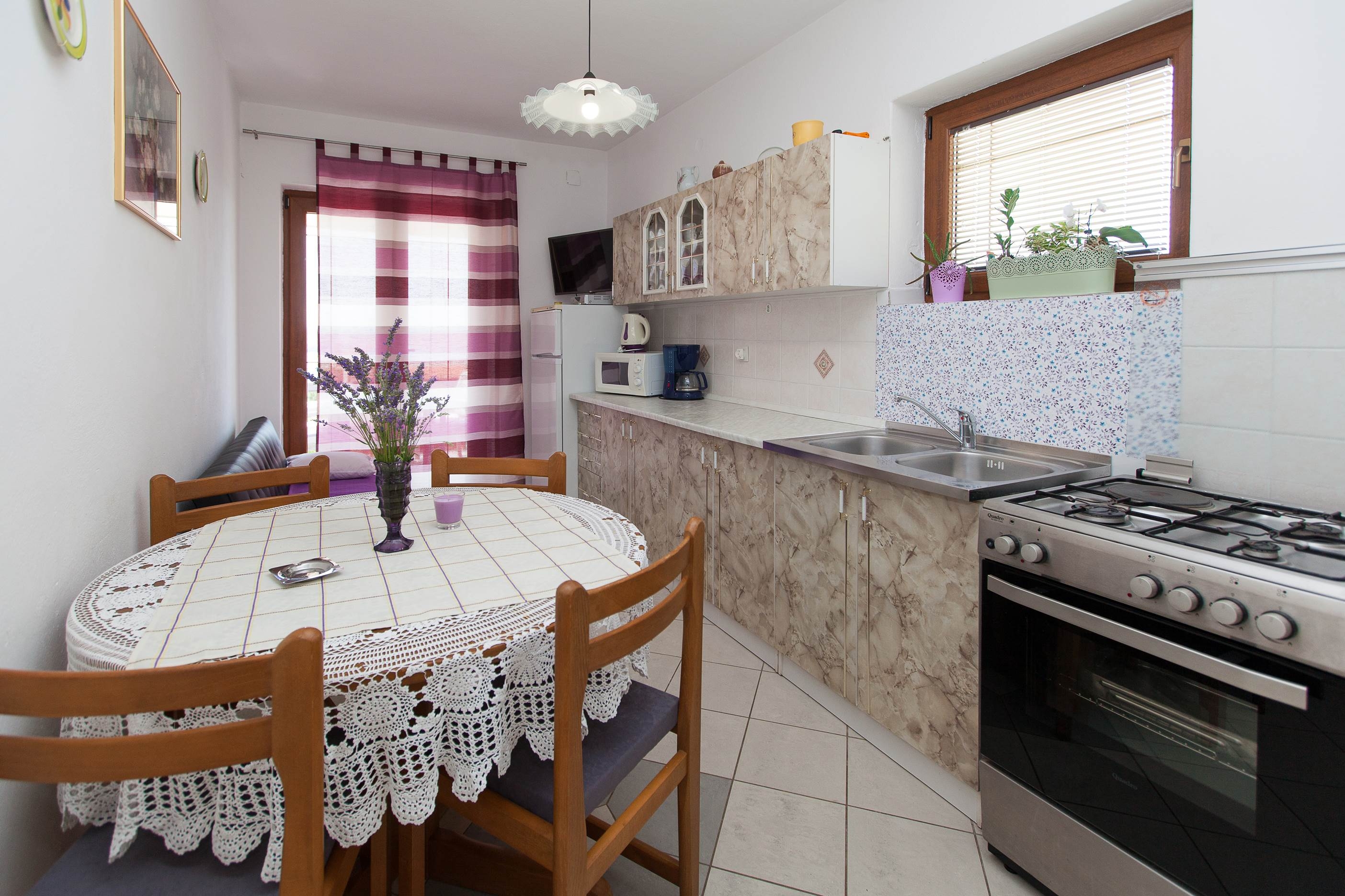 Apartment can accommodate 4 guests. Beds are situated in 2 sleeping rooms, within 46m2. Guests can use a private terrace to enjoy the warm summer evenings. The apartment offers the sea view. Food can be prepared using barbecue which is shared with other guests too. This accommodation unit welcomes pets at an additional charge. INCLUDED IN THE PRICE: tourist tax, final cleaning, parking, internet, bicycle, baby cot, iron, ironing board, hairdryer. OBLIGATORY ADDITIONAL COSTS: short stay fee (surcharge depending on a number of booked nights: 30% - 1, 20% - 2, 10% - 3). OPTIONAL ADDITIONAL COSTS: air-conditioning (€7.00 per night), pets (€10.00 per night). The availability of additional services for your chosen dates of stay, as well as their prices (if none are listed) must be checked ahead of time. Any additional services not shown in the price calculation are payable directly to the property owner and only if used by the visitor.