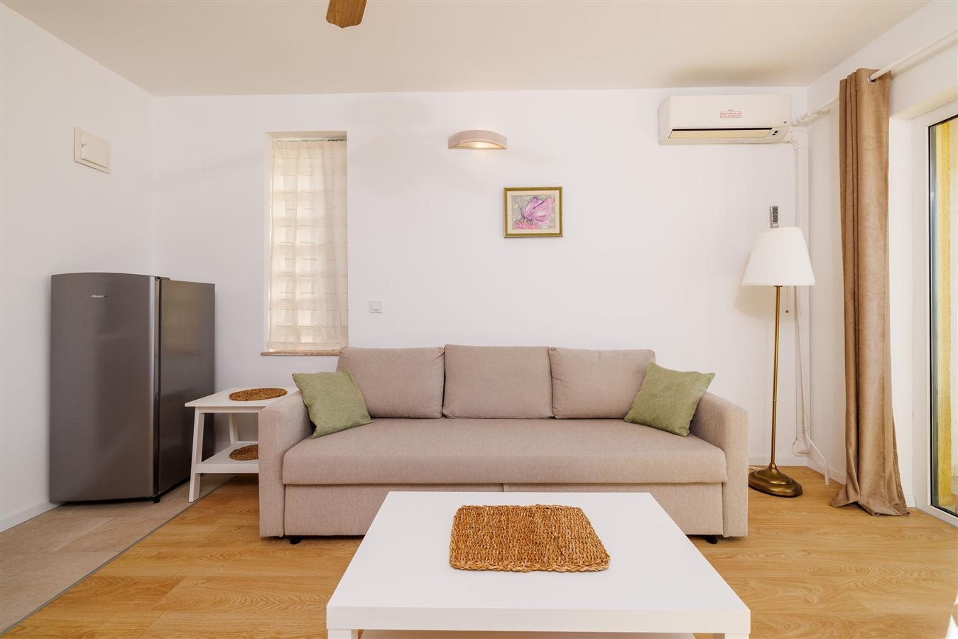 Apartment can accommodate 3 guests. Beds are situated in 1 sleeping rooms, but also in the living room, within 32m2. Guests can use a private balcony to enjoy the warm summer evenings. The apartment offers the sea view. Food can be prepared using barbecue which is shared with other guests too. INCLUDED IN THE PRICE: tourist tax, final cleaning, air-conditioning, parking, internet, iron. OBLIGATORY ADDITIONAL COSTS: short stay fee (surcharge depending on a number of booked nights: 30% - 1, 20% - 2, 10% - 3). OPTIONAL ADDITIONAL COSTS: laundry (€3.00 washing). The availability of additional services for your chosen dates of stay, as well as their prices (if none are listed) must be checked ahead of time. Any additional services not shown in the price calculation are payable directly to the property owner and only if used by the visitor.