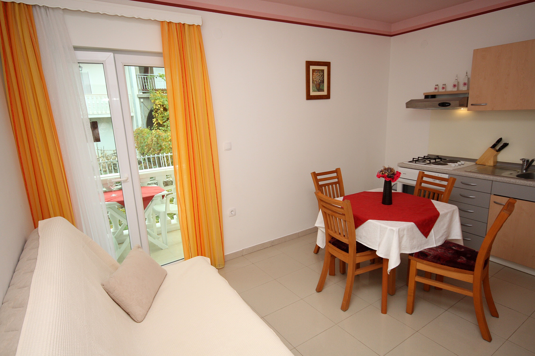 Apartment can accommodate 2 guests. Beds are situated in 1 sleeping rooms, within 40m2. Guests can use a private terrace to enjoy the warm summer evenings. The apartment offers the sea view. Food can be prepared using barbecue which is shared with other guests too. This accommodation unit welcomes pets at an additional charge. INCLUDED IN THE PRICE: final cleaning, air-conditioning, parking, internet, baby cot, iron, ironing board, hairdryer. OBLIGATORY ADDITIONAL COSTS: tourist tax (adults €0.93 - €2.00 nightperson, discount for children aged 12 - 17), short stay fee (surcharge depending on a number of booked nights: 30% - 1, 20% - 2, 10% - 3). OPTIONAL ADDITIONAL COSTS: pets (€12.00 per night). The availability of additional services for your chosen dates of stay, as well as their prices (if none are listed) must be checked ahead of time. Any additional services not shown in the price calculation are payable directly to the property owner and only if used by the visitor.
