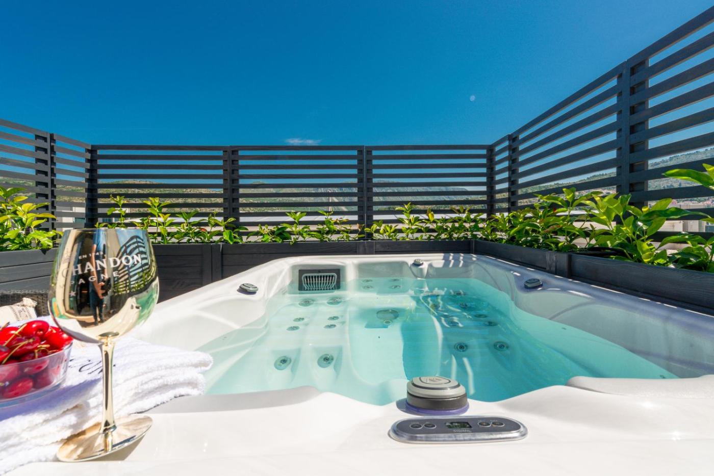 One-Bedroom Apartment. The hot tub is the standout feature of this apartment. Boasting a private entrance, this air-conditioned apartment includes 1 living room, 1 separate bedroom and 1 bathroom with a walk-in shower and a hairdryer. Guests can make meals in the kitchen that has a stovetop, a refrigerator, a dishwasher and kitchenware. Featuring a terrace with mountain views, this apartment also offers a washing machine and a flat-screen TV with streaming services. The unit has 1 bed.