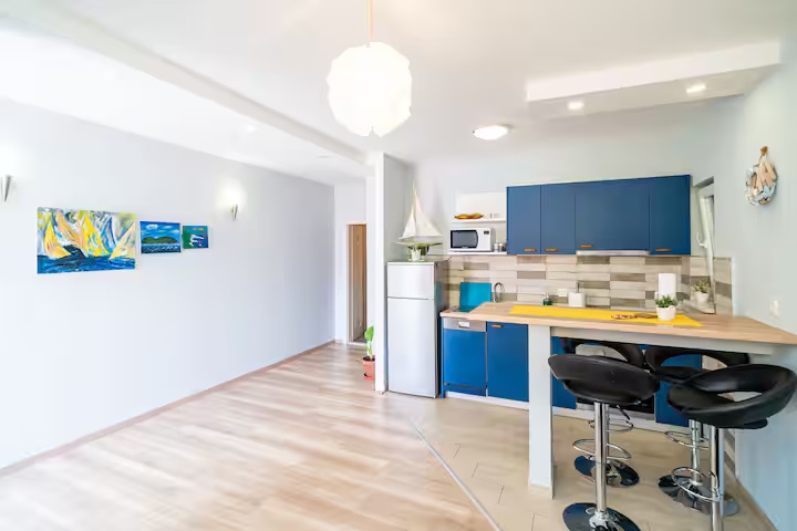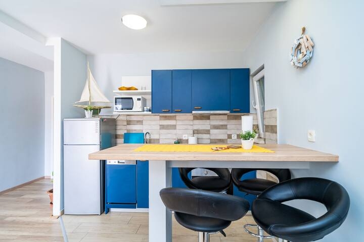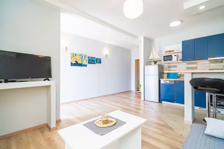 Apartment can accommodate 4 guests. Beds are situated in 1 sleeping rooms, but also in the living room, within 37m2. Guests can use a private terrace to enjoy the warm summer evenings. The apartment offers the sea view. For full enjoyment and relaxation there is a private barbecue for this accommodation guests only. This accommodation unit welcomes pets at an additional charge. INCLUDED IN THE PRICE: tourist tax, final cleaning, air-conditioning, parking, internet, baby cot, iron, ironing board, hairdryer, sunshade. OPTIONAL ADDITIONAL COSTS: pets (€20.00 per night). The availability of additional services for your chosen dates of stay, as well as their prices (if none are listed) must be checked ahead of time. Any additional services not shown in the price calculation are payable directly to the property owner and only if used by the visitor.
