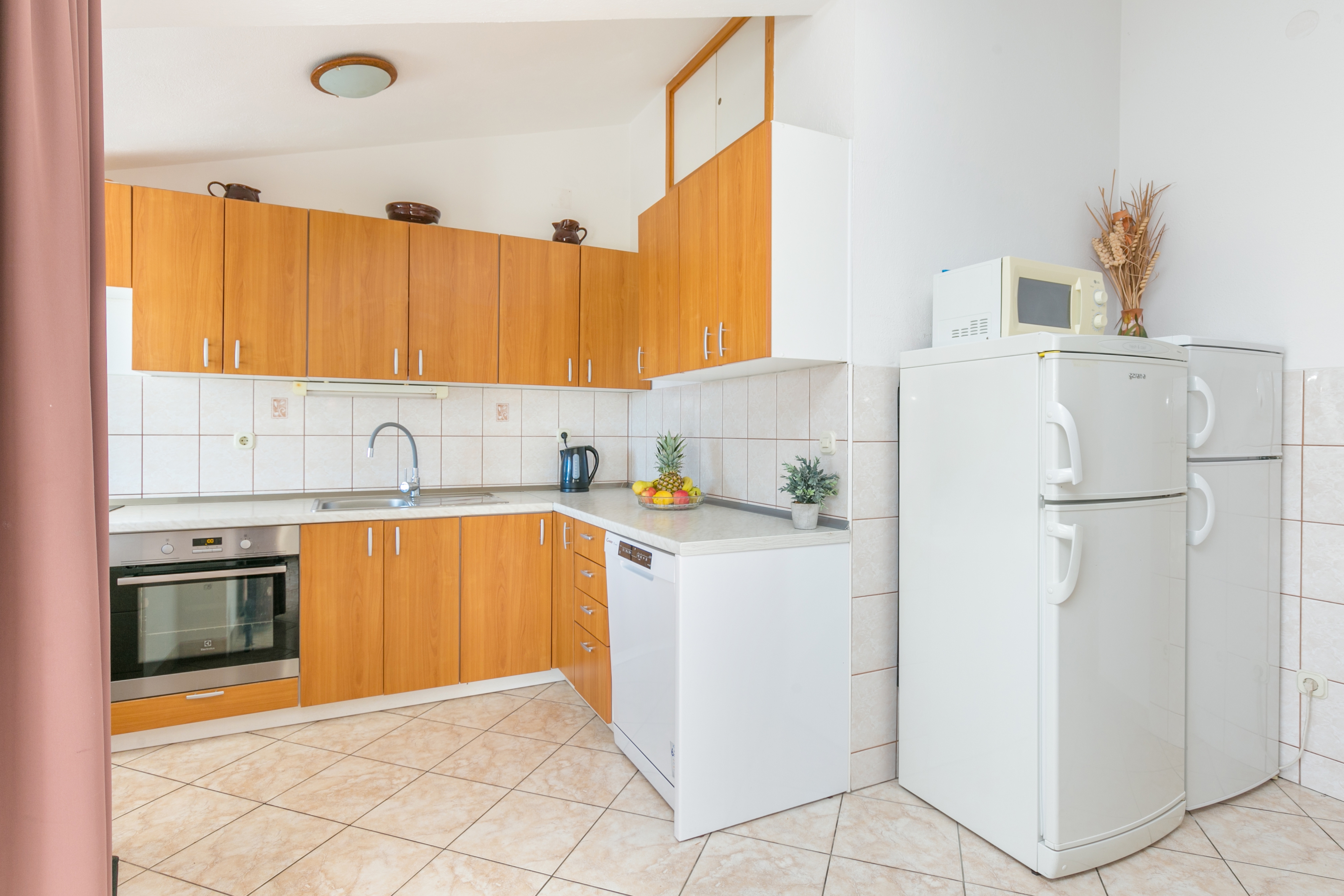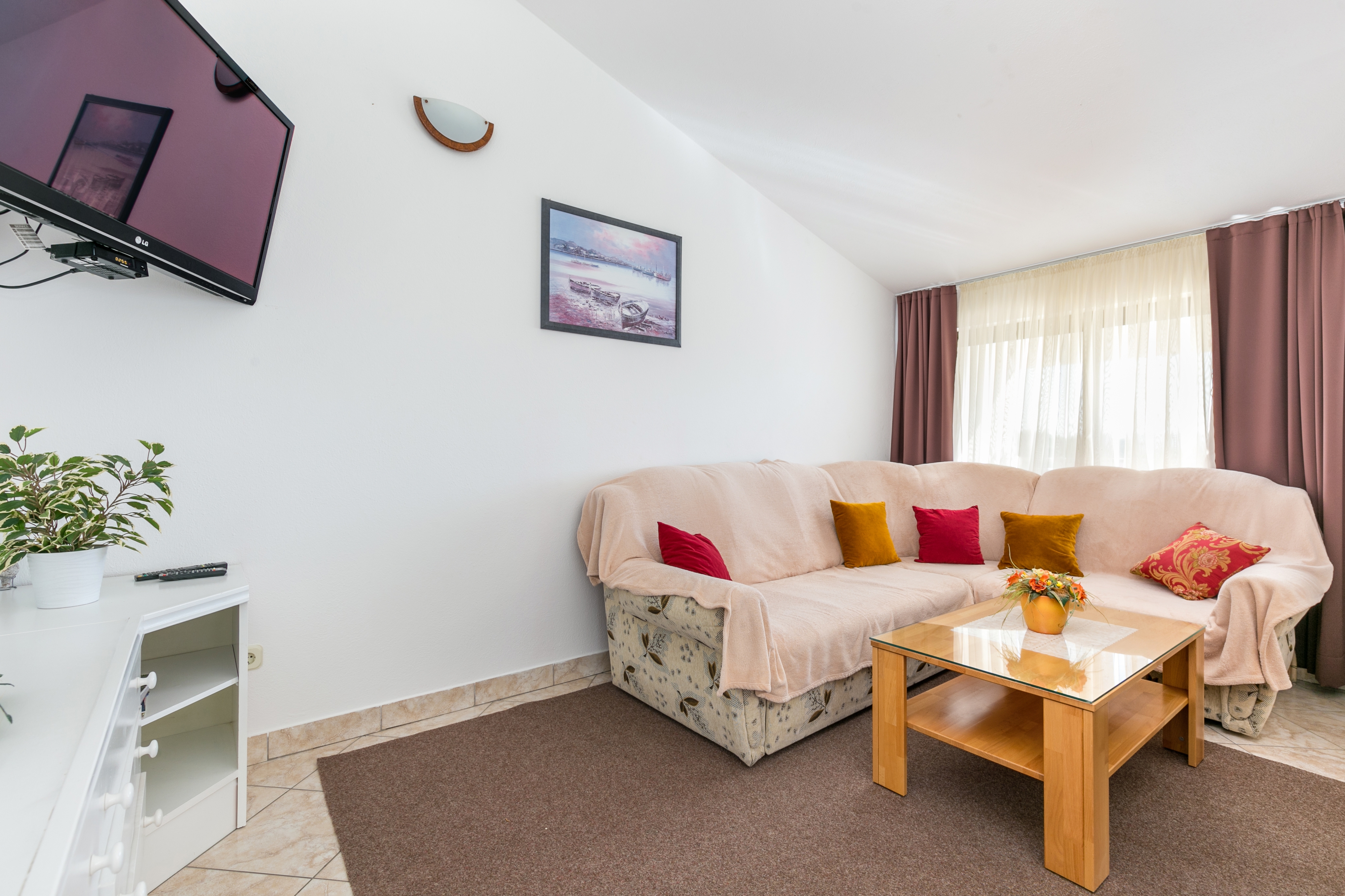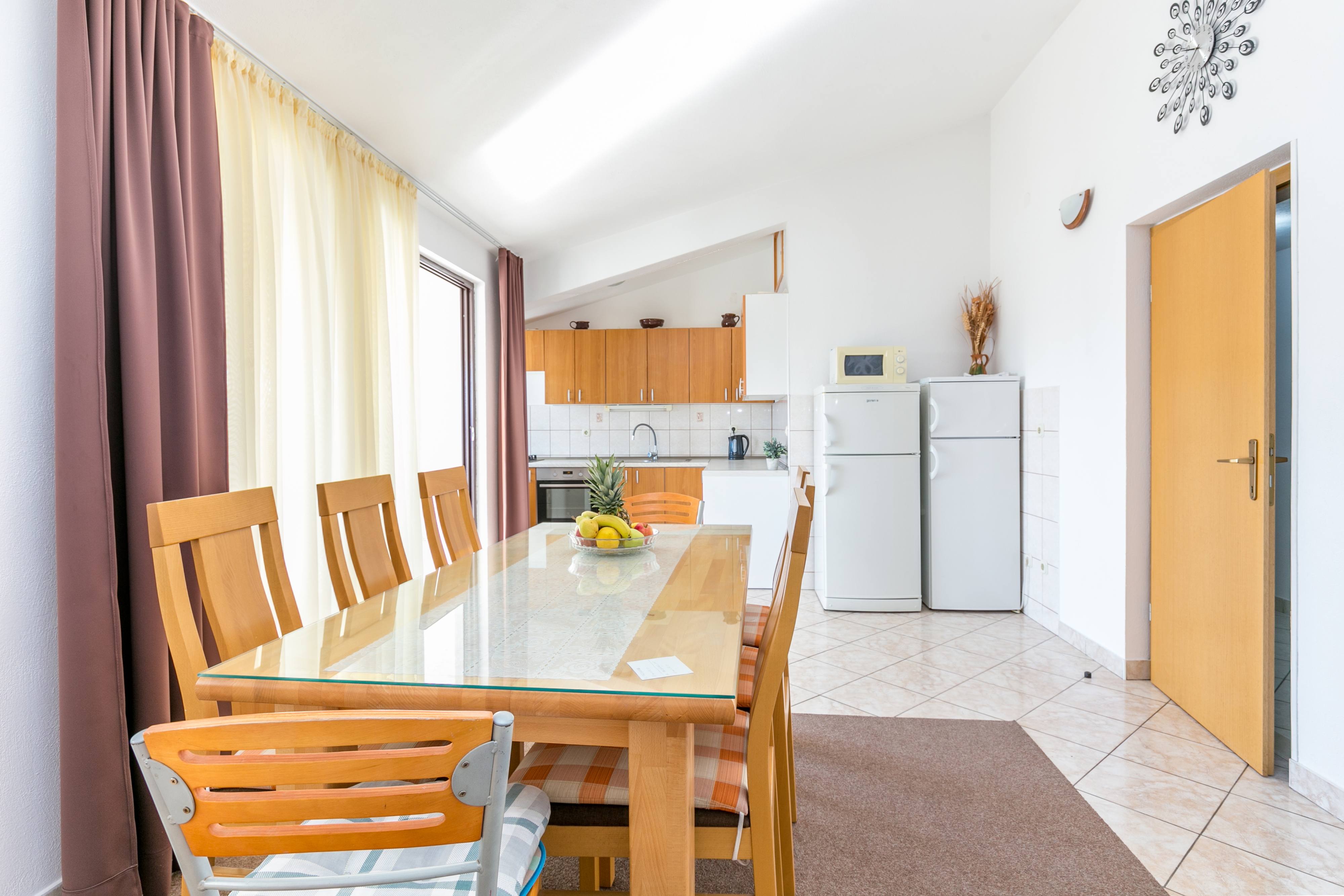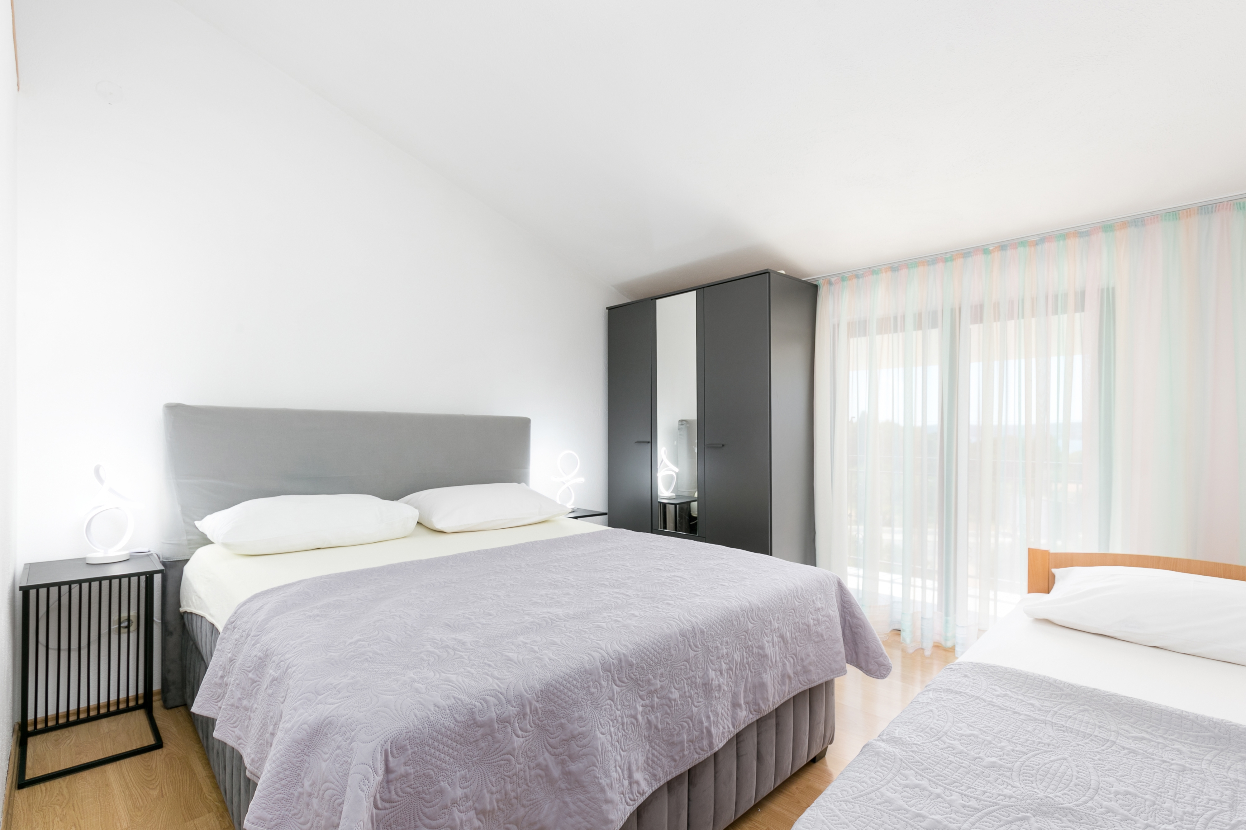 Apartment can accommodate 8 guests. Beds are situated in 4 sleeping rooms, within 107m2. Guests can use a private terrace to enjoy the warm summer evenings. The apartment offers the sea view. Food can be prepared using barbecue which is shared with other guests too. INCLUDED IN THE PRICE: tourist tax, final cleaning, air-conditioning, parking, internet, baby cot, hairdryer. OBLIGATORY ADDITIONAL COSTS: short stay fee (surcharge depending on a number of booked nights: 30% - 1, 20% - 2, 10% - 3). The availability of additional services for your chosen dates of stay, as well as their prices (if none are listed) must be checked ahead of time. Any additional services not shown in the price calculation are payable directly to the property owner and only if used by the visitor. Discounts to the base price: free day 14=13 (for reservations of 14 or more days you get one free day for the stay until 31122026).