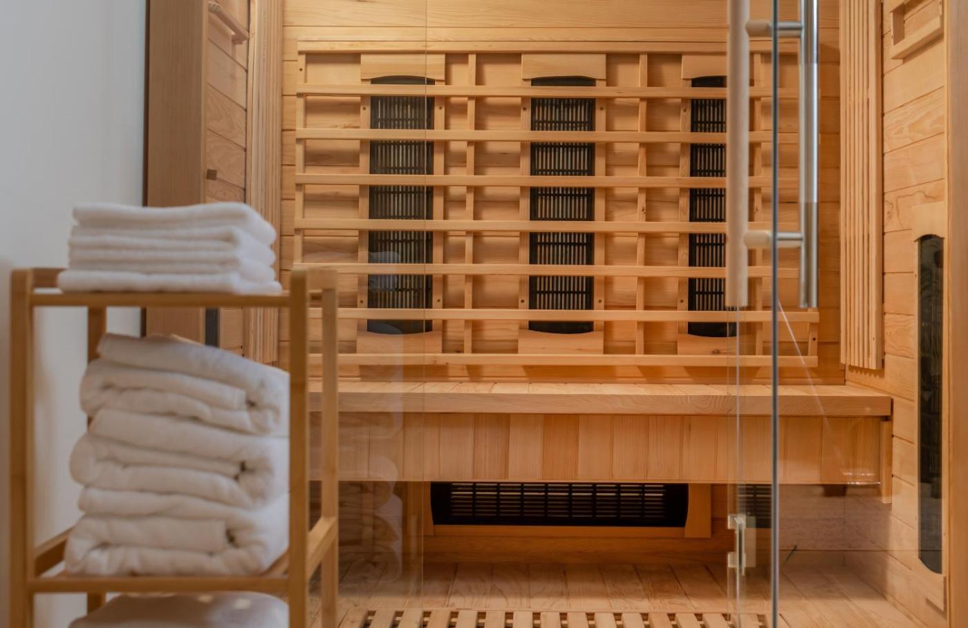 Deluxe Villa. This villas special features are the hot tub and the sauna. Featuring a private entrance, this air-conditioned villa comprises 1 living room, 2 separate bedrooms and 4 bathrooms with a bath and a shower. Guests can make meals in the kitchen that is equipped with a stovetop, a refrigerator, a dishwasher and kitchenware. The villa provides a flat-screen TV with streaming services, a washing machine, a coffee machine, a seating area as well as city views. The unit offers 3 beds.