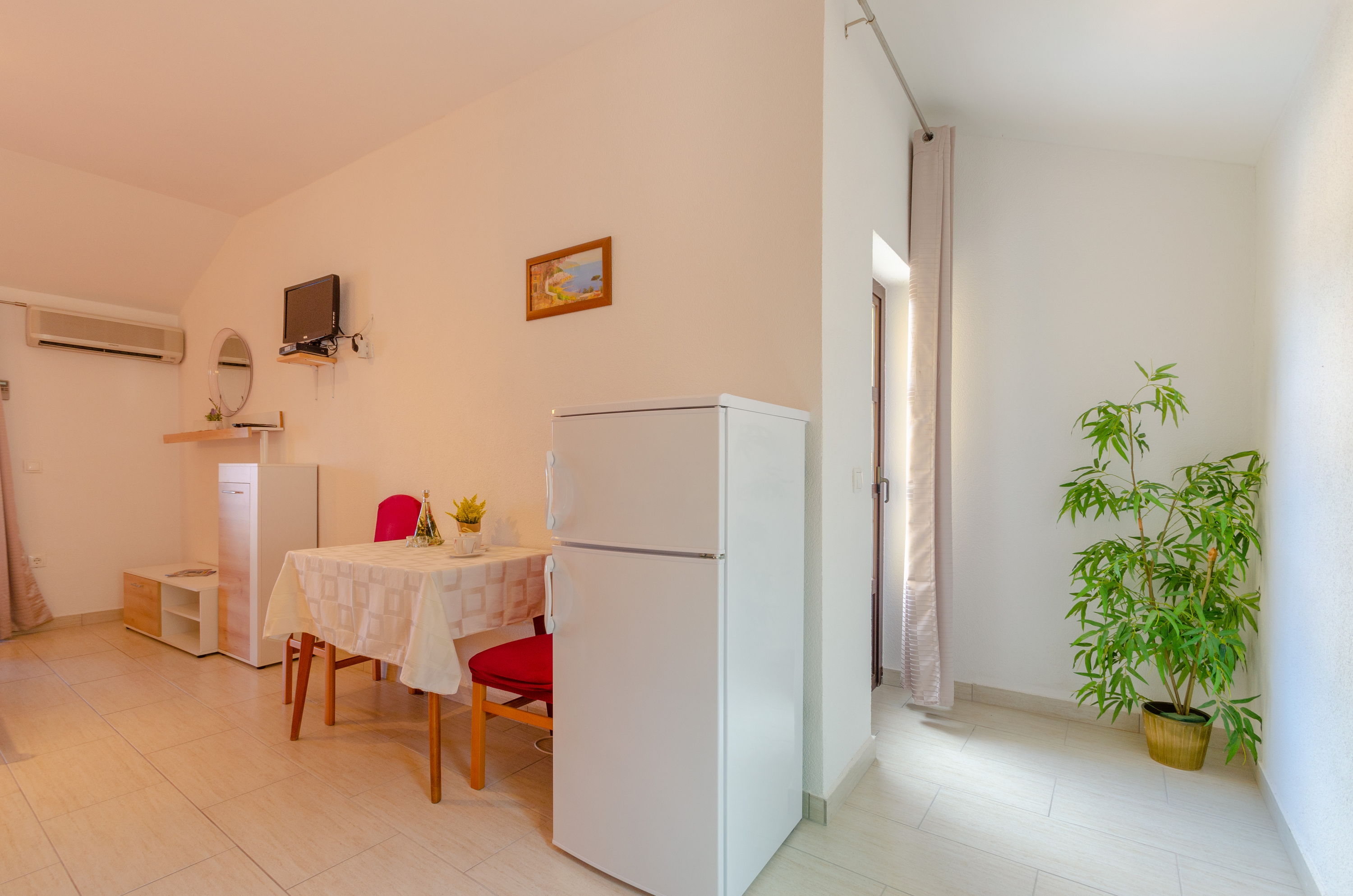 Studio flat can accommodate 2 guests. Beds are situated in 1 sleeping rooms, within 21m2. Guests can use a private terrace to enjoy the warm summer evenings. The studio offers the sea view. Food can be prepared using barbecue which is shared with other guests too. INCLUDED IN THE PRICE: tourist tax, final cleaning, parking, internet, baby cot, iron, ironing board, hairdryer, portable barbecue. OBLIGATORY ADDITIONAL COSTS: short stay fee (surcharge depending on a number of booked nights: 30% - 1, 20% - 2, 10% - 3). OPTIONAL ADDITIONAL COSTS: air-conditioning (€5.00 per night), laundry (€5.00 washing), boat mooring (€5.00 per night). The availability of additional services for your chosen dates of stay, as well as their prices (if none are listed) must be checked ahead of time. Any additional services not shown in the price calculation are payable directly to the property owner and only if used by the visitor. Discounts to the base price: free day 14=13 (for reservations of 14 or more days you get one free day for the stay until 31122026).