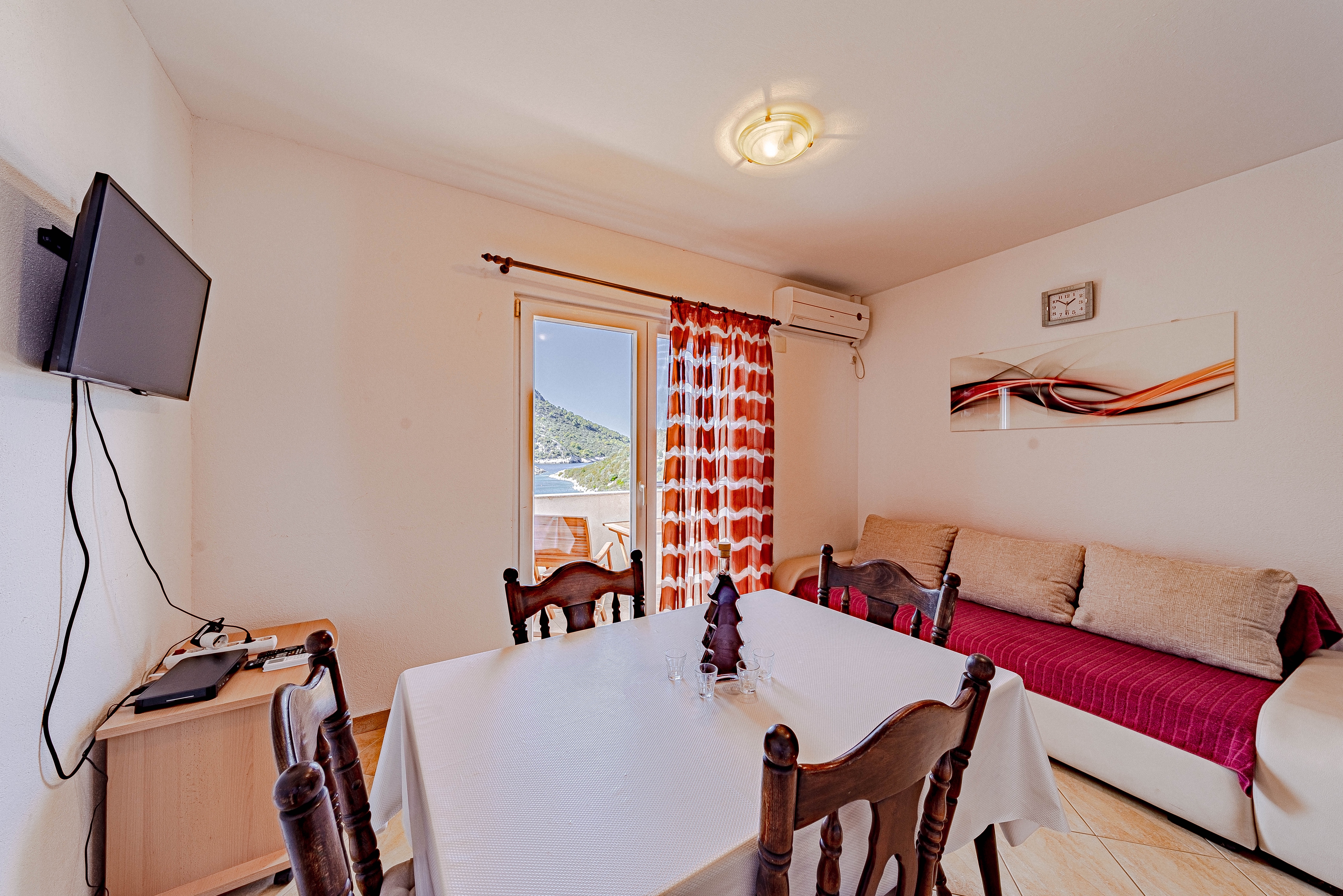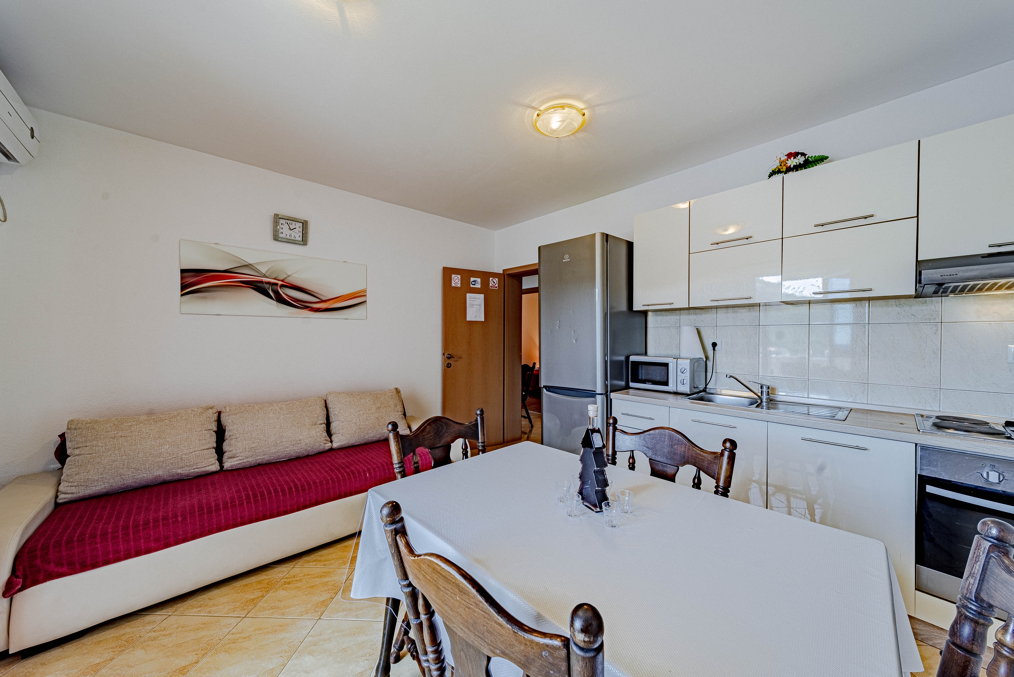 Apartment can accommodate 6 guests. Beds are situated in 2 sleeping rooms, but also in the dining room, within 46m2. Guests can use a private balcony to enjoy the warm summer evenings. The apartment offers the sea view. INCLUDED IN THE PRICE: tourist tax, final cleaning, air-conditioning, parking, internet, baby cot, iron, hairdryer. OBLIGATORY ADDITIONAL COSTS: short stay fee (surcharge depending on a number of booked nights: 30% - 1, 20% - 2, 10% - 3). OPTIONAL ADDITIONAL COSTS: laundry (€8.00 washing), additional bed (€10.00 per night). The availability of additional services for your chosen dates of stay, as well as their prices (if none are listed) must be checked ahead of time. Any additional services not shown in the price calculation are payable directly to the property owner and only if used by the visitor.