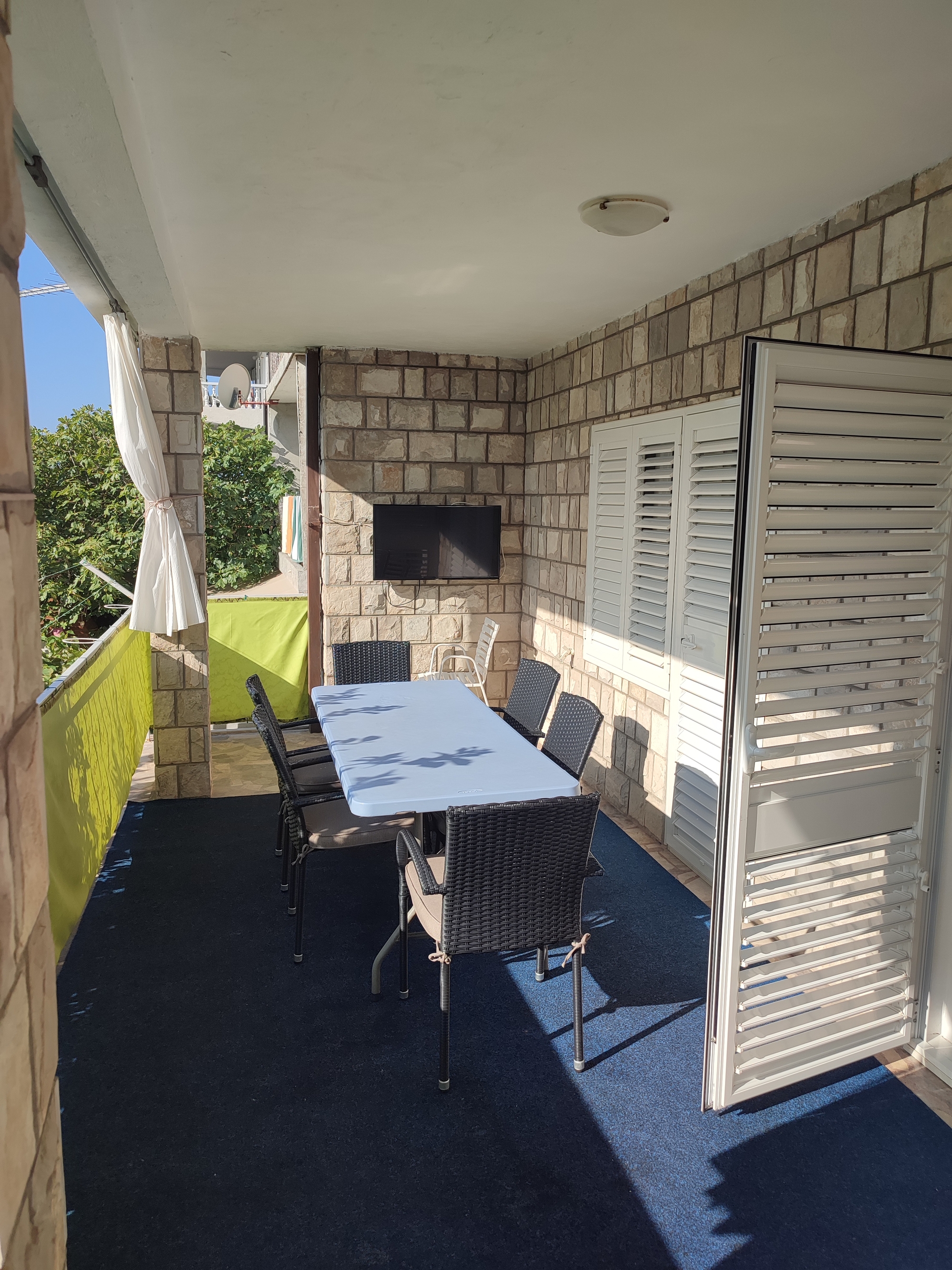 Apartment can accommodate 8 guests. Beds are situated in 2 sleeping rooms, but also in the dining room, within 52m2. Guests can use a private terrace to enjoy the warm summer evenings. Food can be prepared using barbecue which is shared with other guests too. This accommodation unit welcomes pets at an additional charge. INCLUDED IN THE PRICE: tourist tax, final cleaning, air-conditioning, parking, internet, iron, ironing board, hairdryer, portable barbecue. OPTIONAL ADDITIONAL COSTS: pets (€5.00 per night). The availability of additional services for your chosen dates of stay, as well as their prices (if none are listed) must be checked ahead of time. Any additional services not shown in the price calculation are payable directly to the property owner and only if used by the visitor.