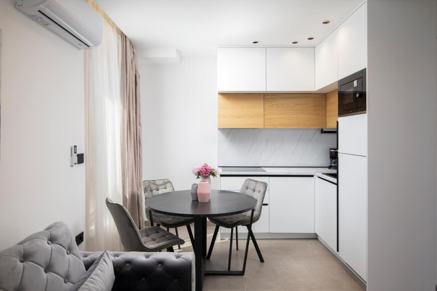 One-Bedroom Apartment with Balcony. Boasting a private entrance, this air-conditioned apartment comes with 1 living room, 1 separate bedroom and 1 bathroom with a walk-in shower and a hairdryer. In the kitchen, guests will find a stovetop, a refrigerator, a dishwasher and kitchenware. Featuring a balcony with city views, this apartment also features a coffee machine and a flat-screen TV with cable channels. The unit has 2 beds.
