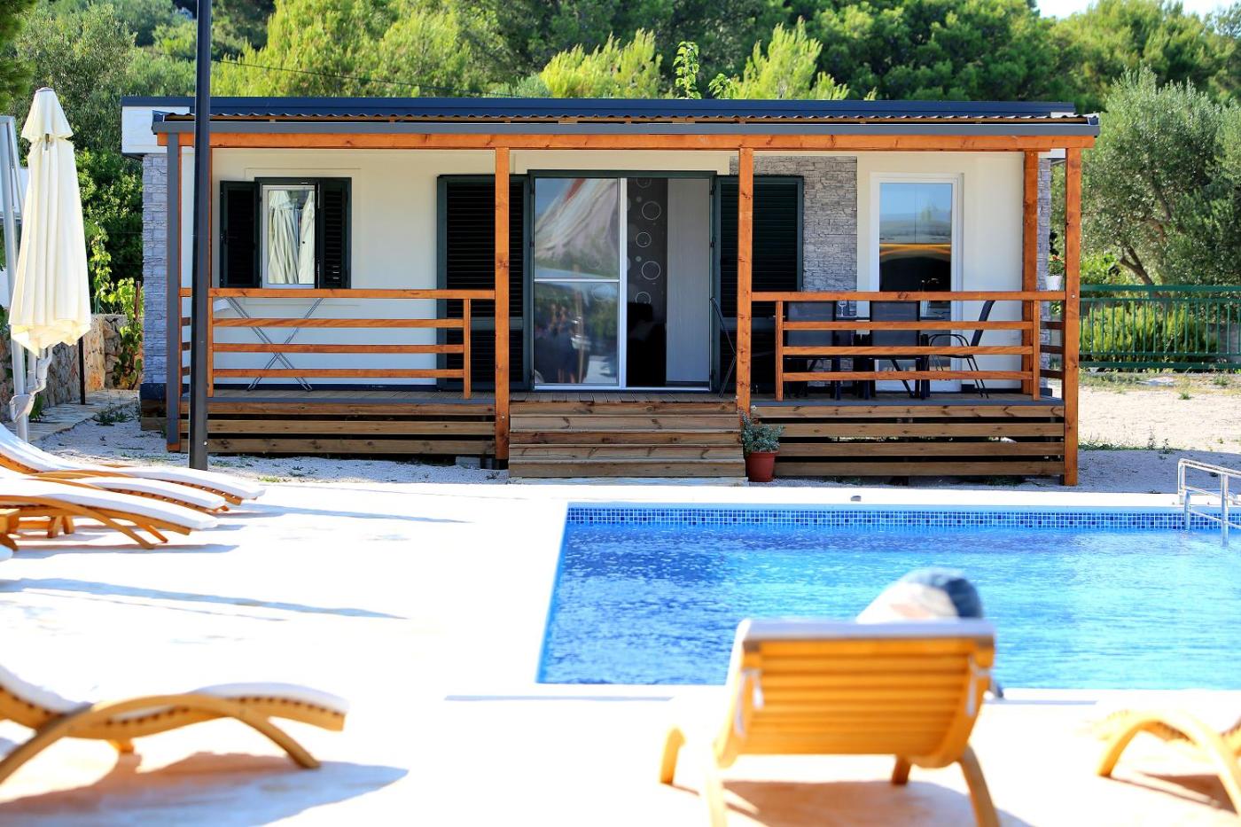 Mobile Home. Guests will have a special experience as this mobile home features a pool with a view. Featuring a private entrance, this air-conditioned mobile home is comprised of 1 living room, 2 separate bedrooms and 2 bathrooms with a shower and a hairdryer. Guests will find a stovetop, a refrigerator, a dishwasher and kitchenware in the fully equipped kitchen. The mobile home also has a barbecue. Boasting a terrace with garden views, this mobile home also offers soundproof walls and a flat-screen TV with satellite channels. The unit offers 4 beds. ;