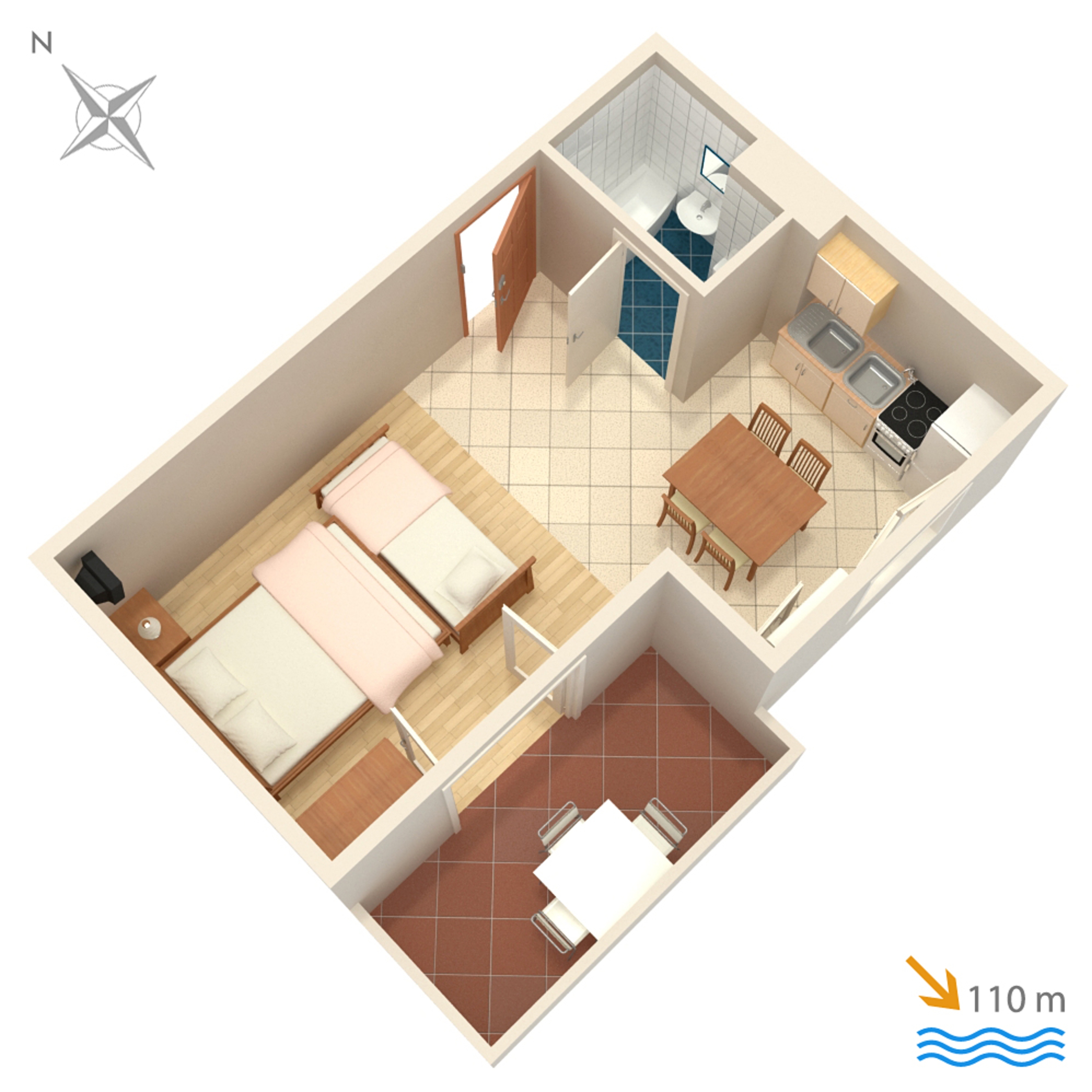 Studio flat can accommodate 4 guests. Beds are situated in 1 sleeping rooms, within 27m2. Guests can use a private terrace to enjoy the warm summer evenings. The studio offers the sea view. Food can be prepared using barbecue which is shared with other guests too. INCLUDED IN THE PRICE: tourist tax, final cleaning, air-conditioning, parking, internet, laundry, iron, ironing board, hairdryer. OBLIGATORY ADDITIONAL COSTS: short stay fee (surcharge depending on a number of booked nights: 30% - 1, 20% - 2, 10% - 3). OPTIONAL ADDITIONAL COSTS: central heating (€3.00 per night). The availability of additional services for your chosen dates of stay, as well as their prices (if none are listed) must be checked ahead of time. Any additional services not shown in the price calculation are payable directly to the property owner and only if used by the visitor.