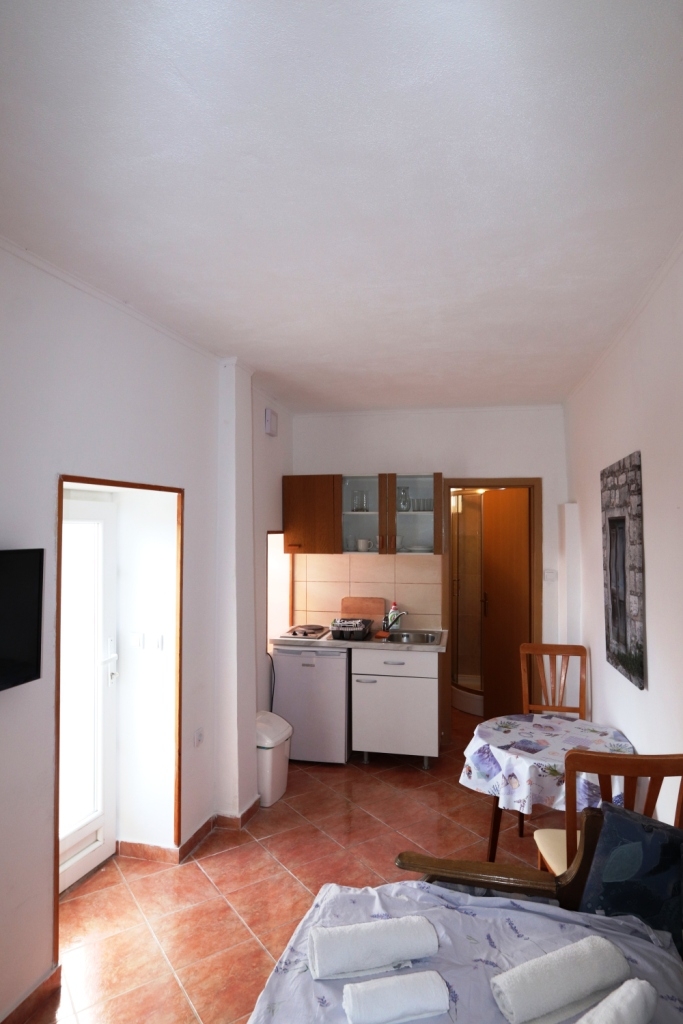Studio flat can accommodate 2 guests. Beds are situated in 1 sleeping rooms, within 21m2. Food can be prepared using barbecue which is shared with other guests too. This accommodation unit welcomes pets at an additional charge. There is no balcony or terrace in the reserved accommodation unit. INCLUDED IN THE PRICE: tourist tax, final cleaning, air-conditioning, parking, internet, laundry, iron, hairdryer. OBLIGATORY ADDITIONAL COSTS: short stay fee (surcharge depending on a number of booked nights: 30% - 1, 20% - 2, 10% - 3). OPTIONAL ADDITIONAL COSTS: pets (€10.00 per night). The availability of additional services for your chosen dates of stay, as well as their prices (if none are listed) must be checked ahead of time. Any additional services not shown in the price calculation are payable directly to the property owner and only if used by the visitor. Discounts to the base price: free day 14=13 (for reservations of 14 or more days you get one free day for the stay until 31122026).
