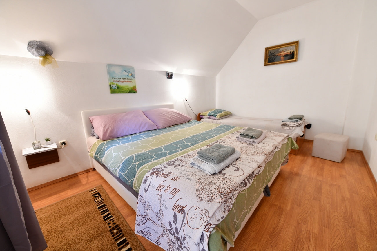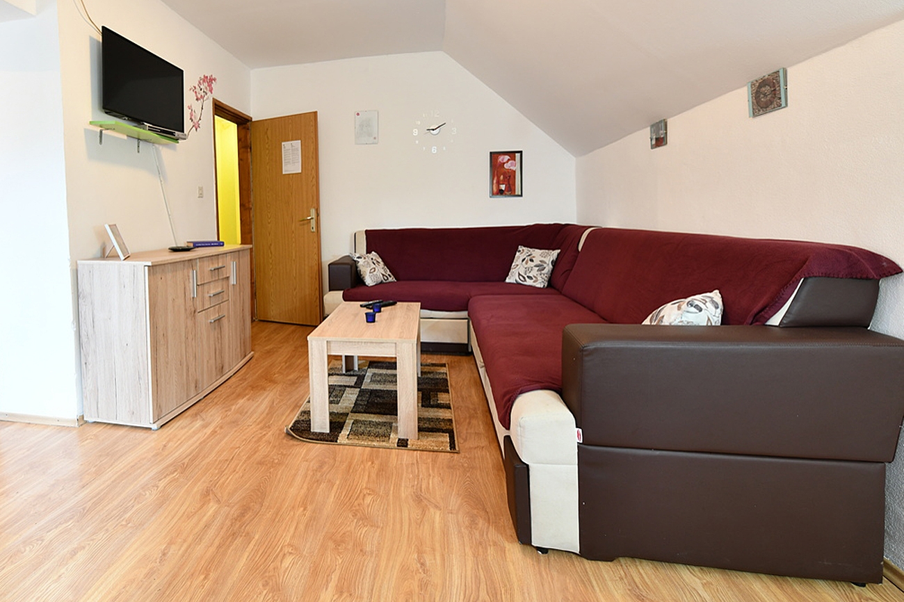 Apartment can accommodate 3 guests. Beds are situated in 1 sleeping rooms, but also in the living room, within 63m2. Guests can use a private balcony to enjoy the warm summer evenings. Food can be prepared using barbecue which is shared with other guests too. This accommodation unit welcomes pets at no additional costs. INCLUDED IN THE PRICE: tourist tax, final cleaning, parking, internet, pets, baby cot, iron, ironing board, hairdryer, portable barbecue. The availability of additional services for your chosen dates of stay, as well as their prices (if none are listed) must be checked ahead of time. Any additional services not shown in the price calculation are payable directly to the property owner and only if used by the visitor.