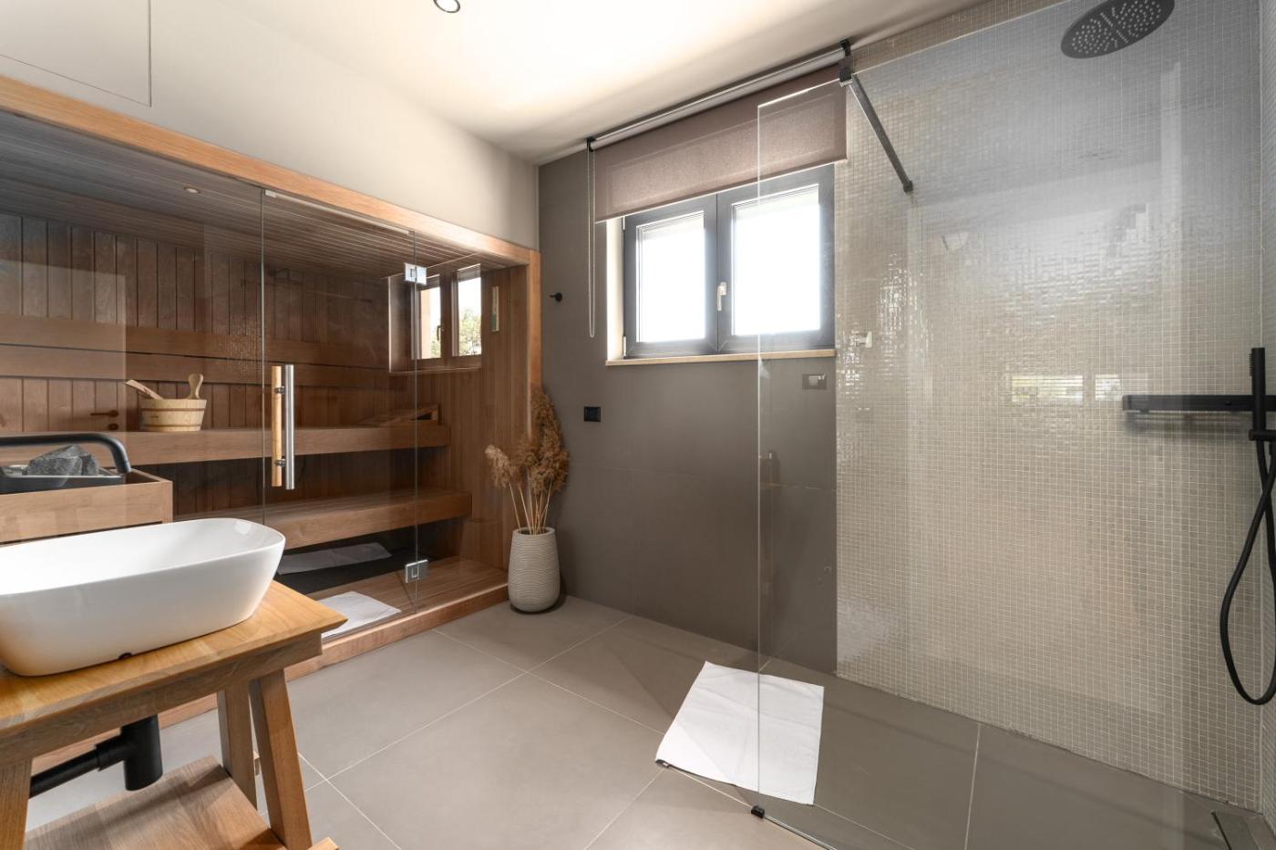 Two-Bedroom Villa. Guests will have a special experience as this villa features a pool with a view, a hot tub and a sauna. Featuring a private entrance, this air-conditioned villa consists of a kitchen, 2 bedrooms and 2 bathrooms with a walk-in shower and a bidet. Guests will find a stovetop, a refrigerator, a dishwasher and kitchenware in the kitchen. The villa also offers a barbecue. Boasting a terrace with garden views, this villa also provides a washing machine and a flat-screen TV with satellite channels. The unit offers 2 beds.