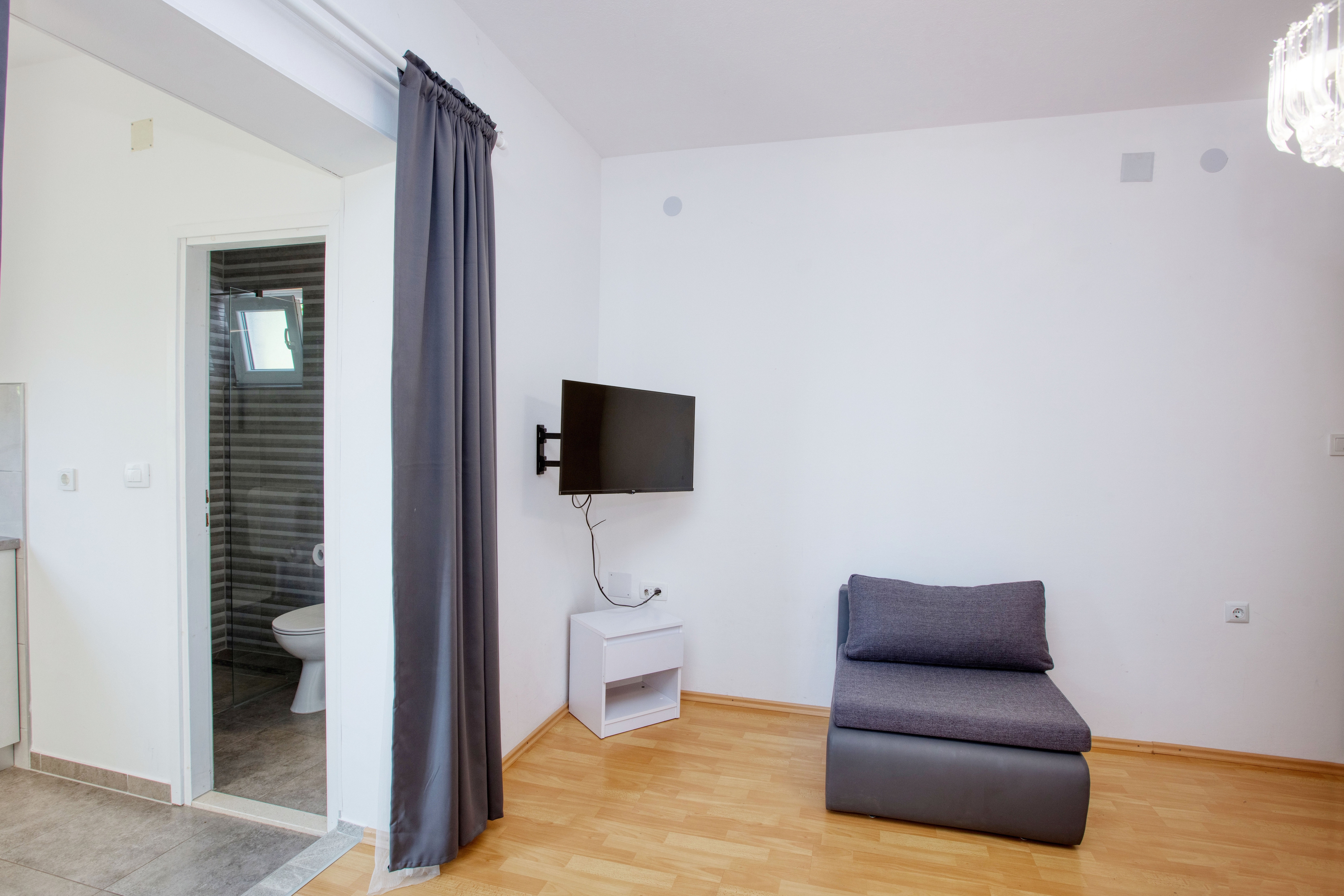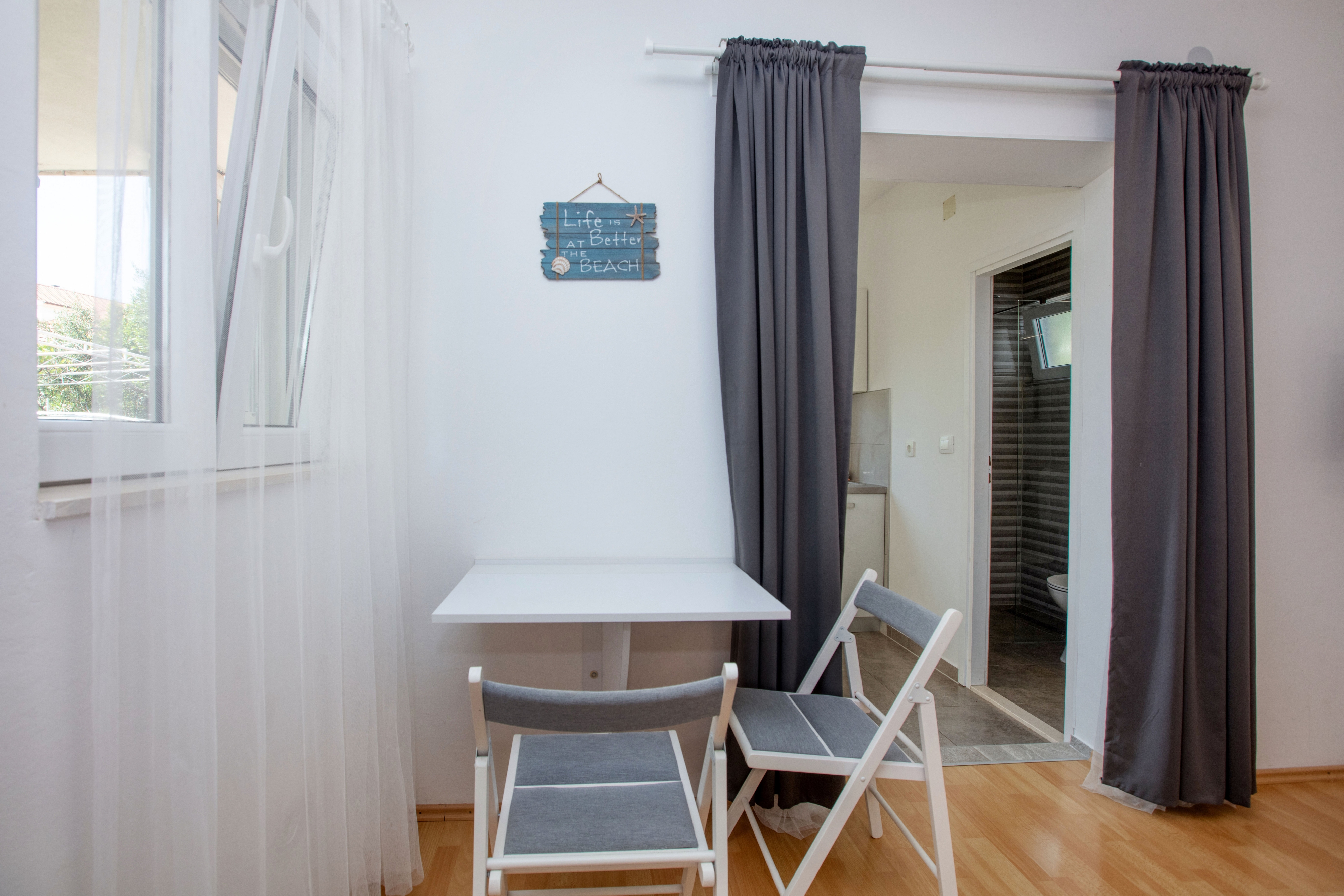 Studio flat can accommodate 3 guests. Beds are situated in 1 sleeping rooms, within 23m2. Guests can use a private terrace to enjoy the warm summer evenings. Food can be prepared using barbecue which is shared with other guests too. INCLUDED IN THE PRICE: tourist tax, final cleaning, air-conditioning, parking, internet, iron, hairdryer. OBLIGATORY ADDITIONAL COSTS: short stay fee (surcharge depending on a number of booked nights: 30% - 1, 20% - 2, 10% - 3). The availability of additional services for your chosen dates of stay, as well as their prices (if none are listed) must be checked ahead of time. Any additional services not shown in the price calculation are payable directly to the property owner and only if used by the visitor.
