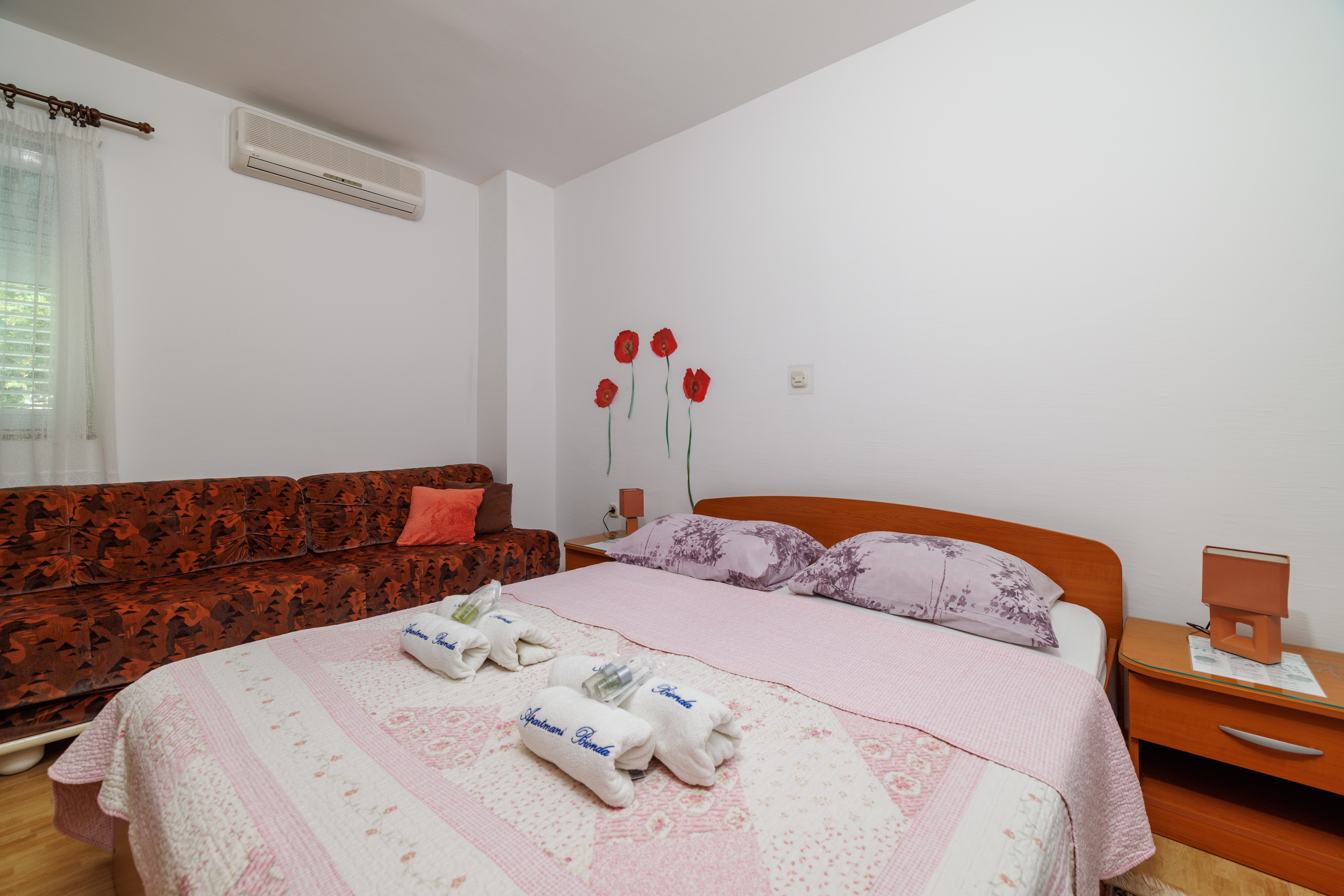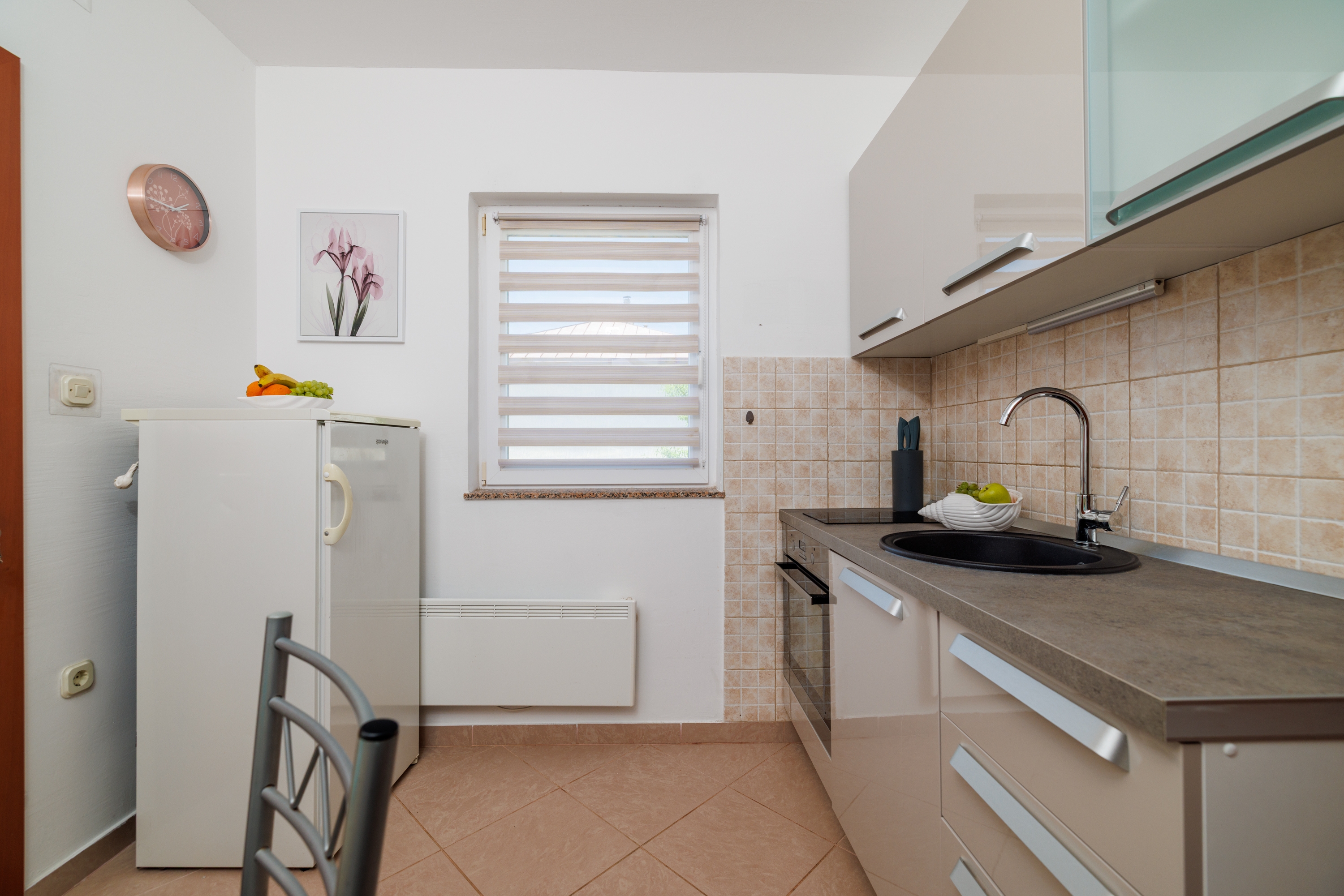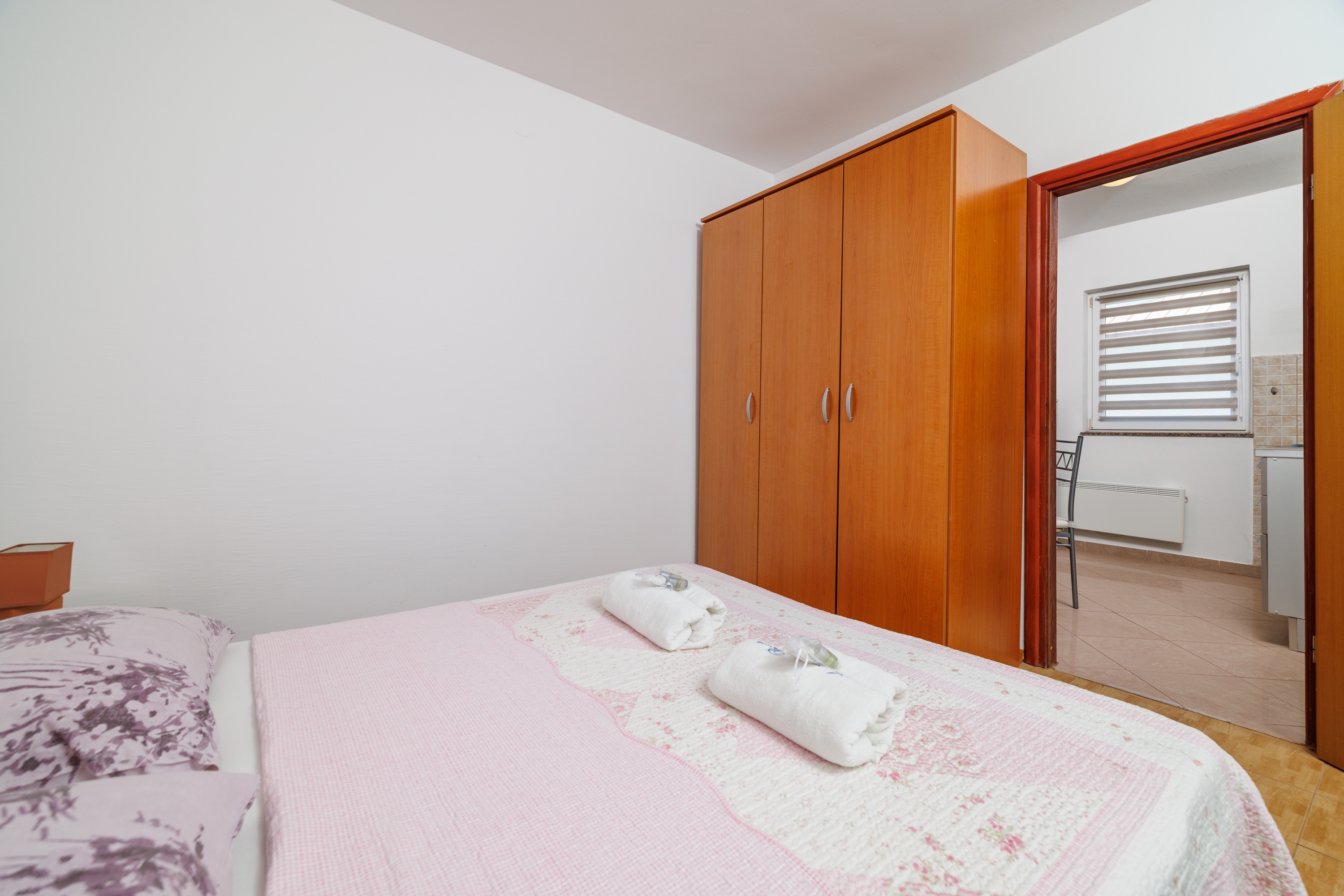 Apartment can accommodate 3 guests. Beds are situated in 1 sleeping rooms, within 23m2. Guests can use a private terrace to enjoy the warm summer evenings. The apartment offers the sea view. Food can be prepared using barbecue which is shared with other guests too. Some of the rooms of the accommodation unit are not connected with the rest of the unit. INCLUDED IN THE PRICE: tourist tax, final cleaning, parking, internet, iron. OPTIONAL ADDITIONAL COSTS: air-conditioning (€5.00 per night), laundry (€5.00 washing), additional bed (€7.00 per night). The availability of additional services for your chosen dates of stay, as well as their prices (if none are listed) must be checked ahead of time. Any additional services not shown in the price calculation are payable directly to the property owner and only if used by the visitor. Discounts to the base price: free day 14=13 (for reservations of 14 or more days you get one free day for the stay until 31122026).