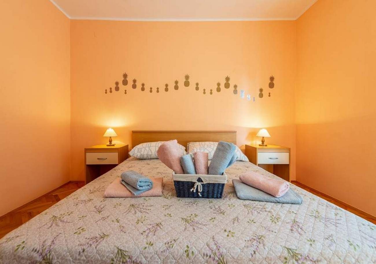 Apartment can accommodate 4 guests. Beds are situated in 1 sleeping rooms, but also in the dining room, within 47m2. Guests can use a private terrace to enjoy the warm summer evenings. Food can be prepared using barbecue which is shared with other guests too. INCLUDED IN THE PRICE: tourist tax, final cleaning, air-conditioning, parking, internet. OBLIGATORY ADDITIONAL COSTS: short stay fee (surcharge depending on a number of booked nights: 30% - 1, 20% - 2, 10% - 3). The availability of additional services for your chosen dates of stay, as well as their prices (if none are listed) must be checked ahead of time. Any additional services not shown in the price calculation are payable directly to the property owner and only if used by the visitor.