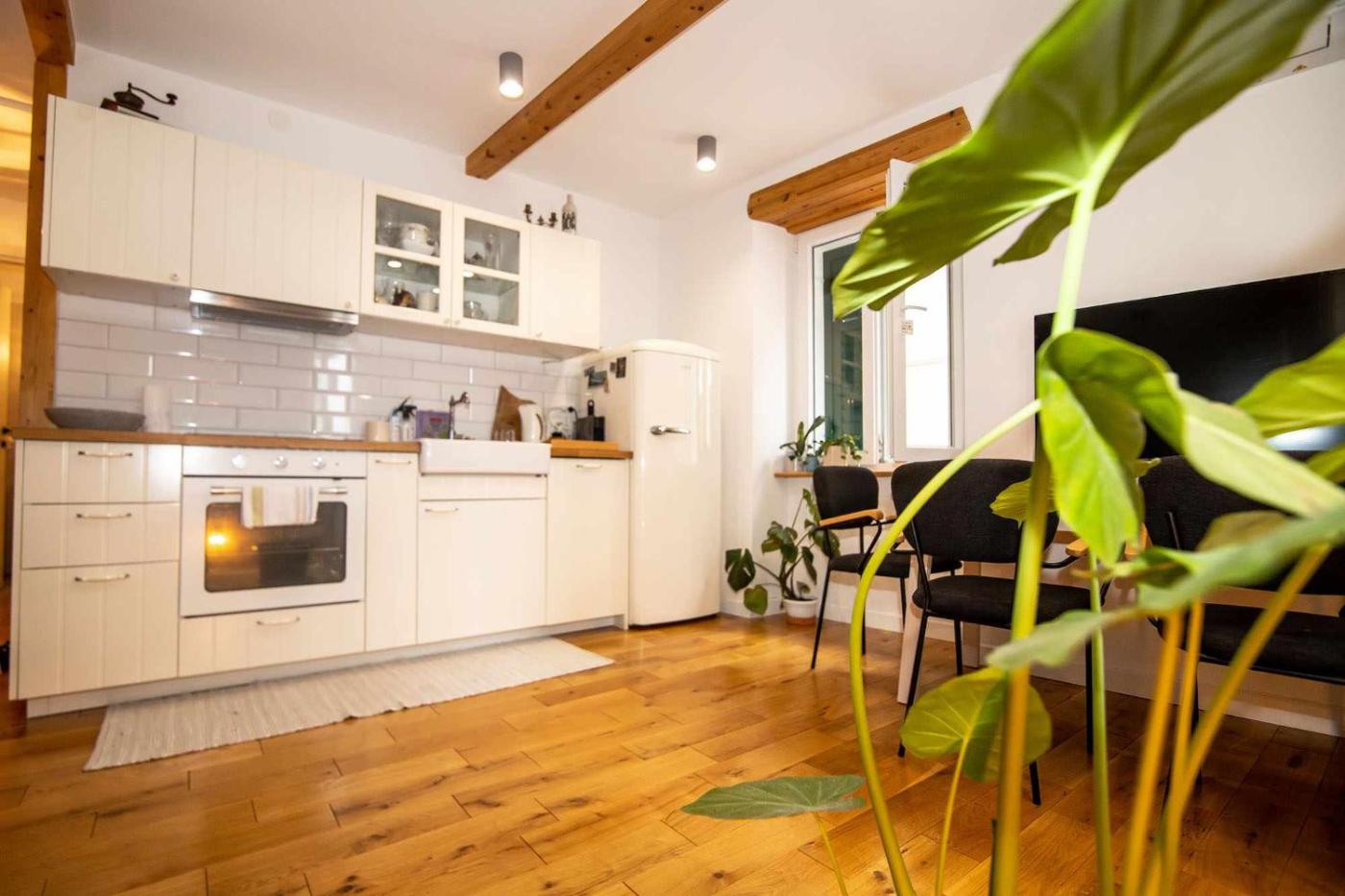 One-Bedroom Apartment. This air-conditioned apartment comes with 1 living room, 1 separate bedroom and 1 bathroom with a walk-in shower. Meals can be prepared in the well-fitted kitchen, which features a stovetop, a refrigerator, a dishwasher and kitchenware. The apartment features a washing machine, a tea and coffee maker, a sofa, heating, as well as a flat-screen TV. The unit has 2 beds.