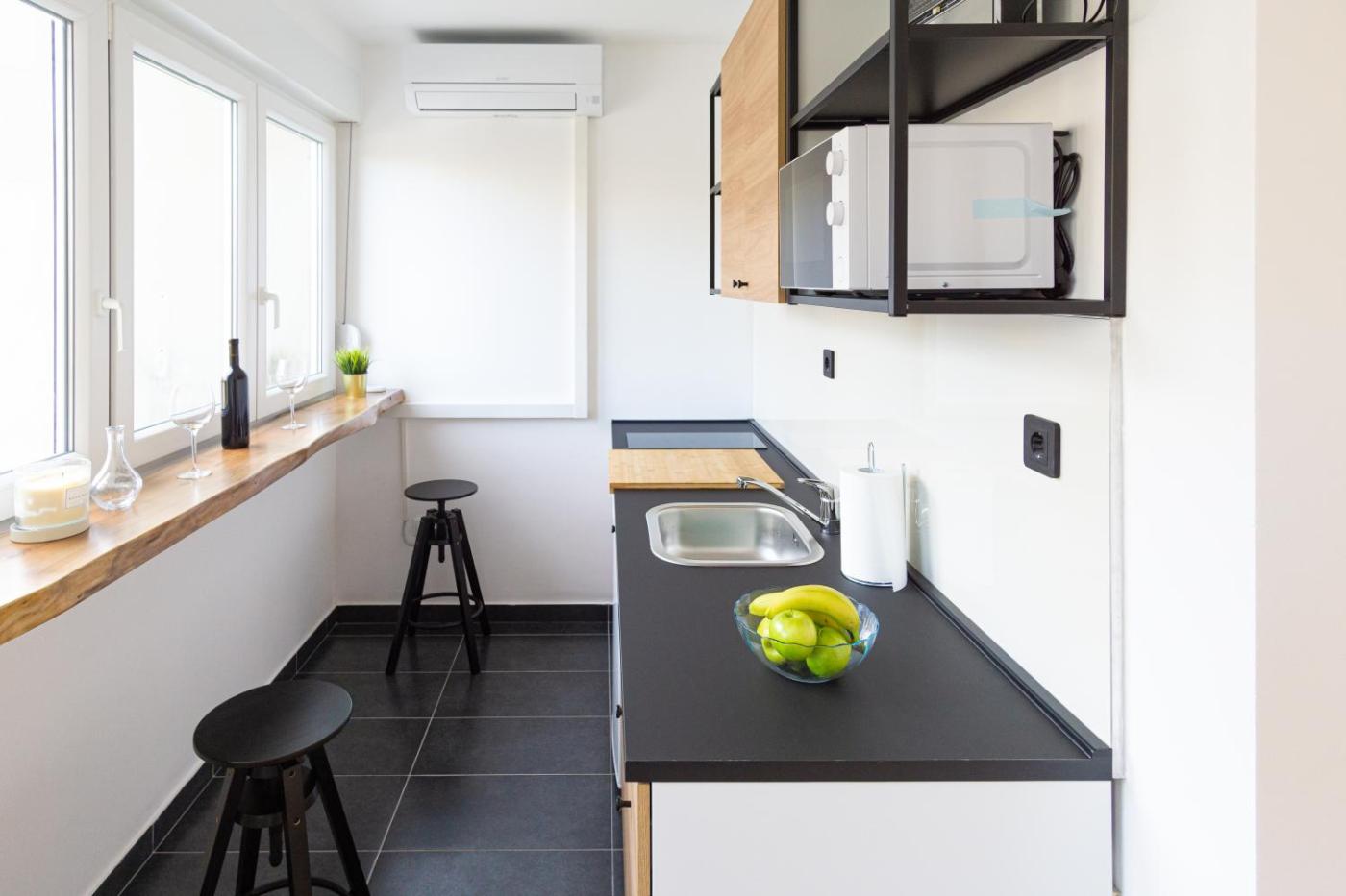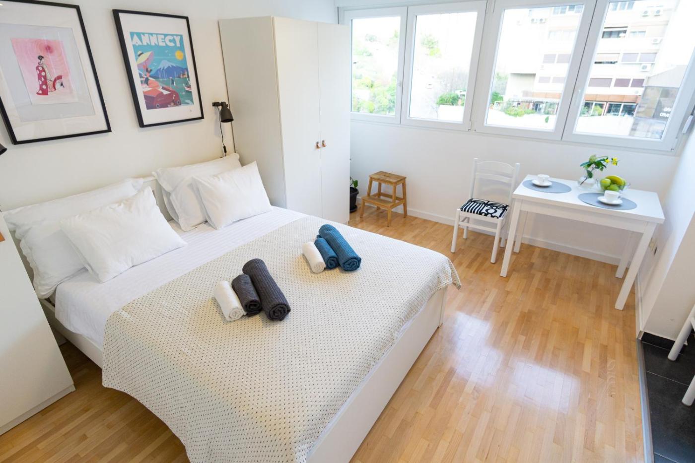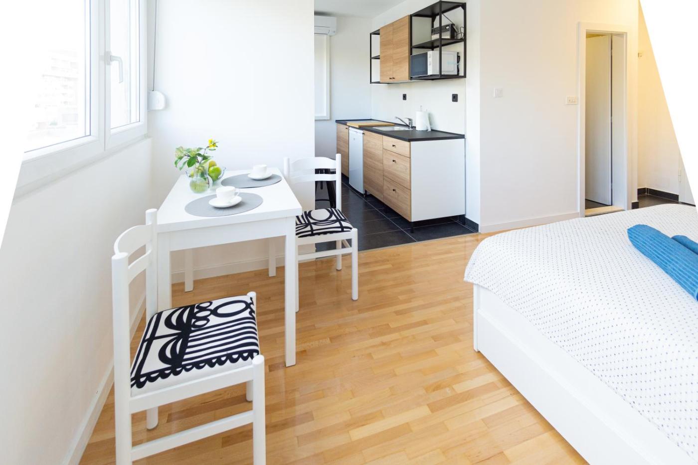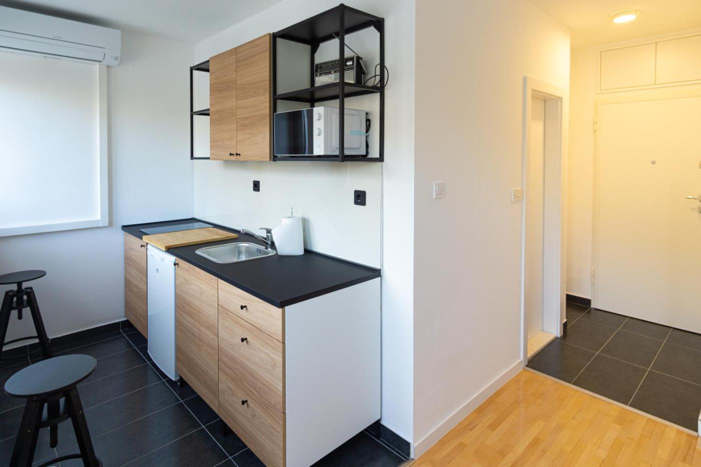 One-Bedroom Apartment. Featuring a private entrance, this air-conditioned apartment comprises a kitchen, 1 bedroom and 1 bathroom with a walk-in shower and a hairdryer. Guests can make meals in the kitchen that comes with a stovetop, a refrigerator, kitchenware and a microwave. The apartment provides a flat-screen TV, a dining area, a wardrobe, parquet floors as well as city views. The unit offers 1 bed.