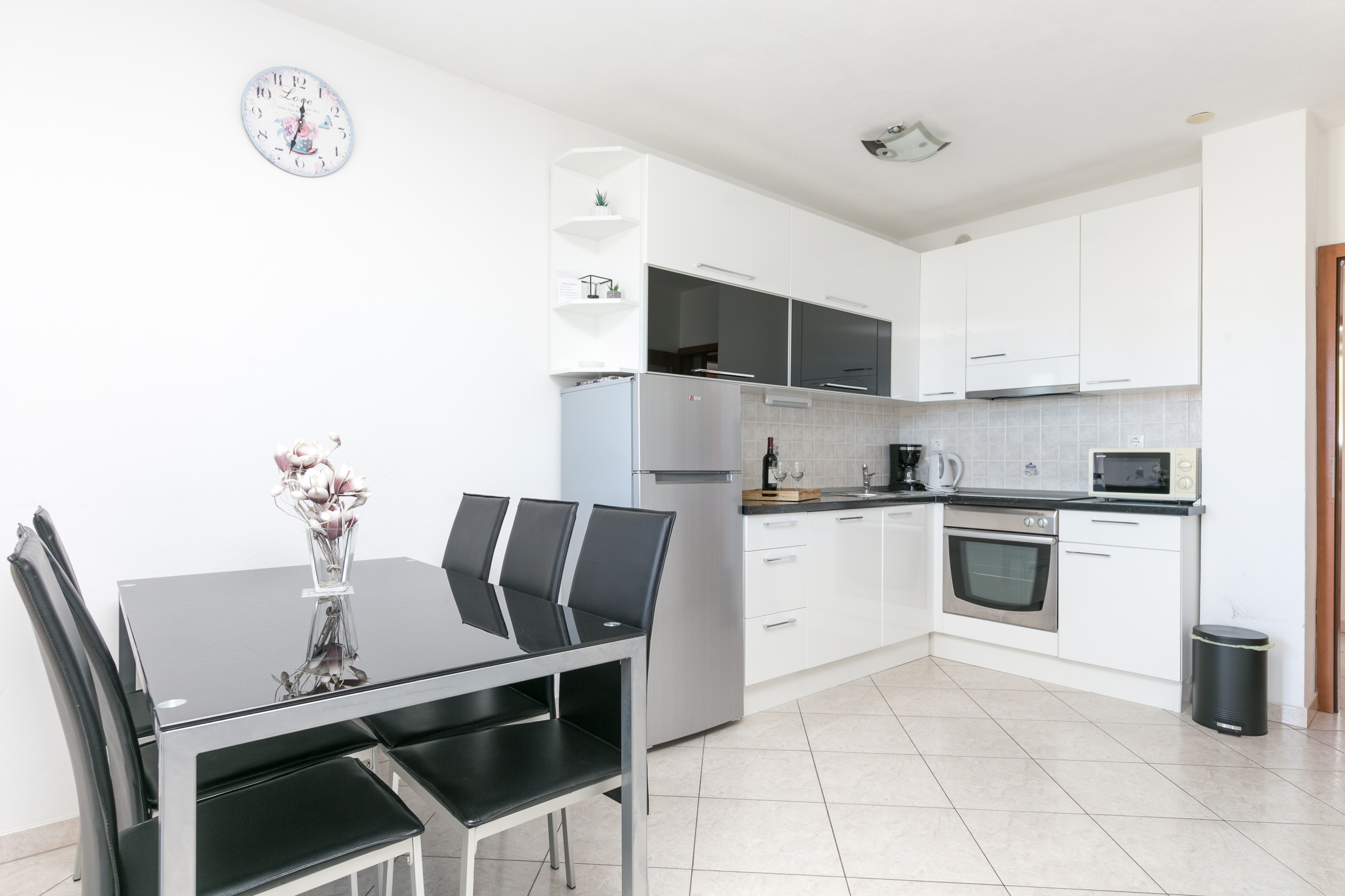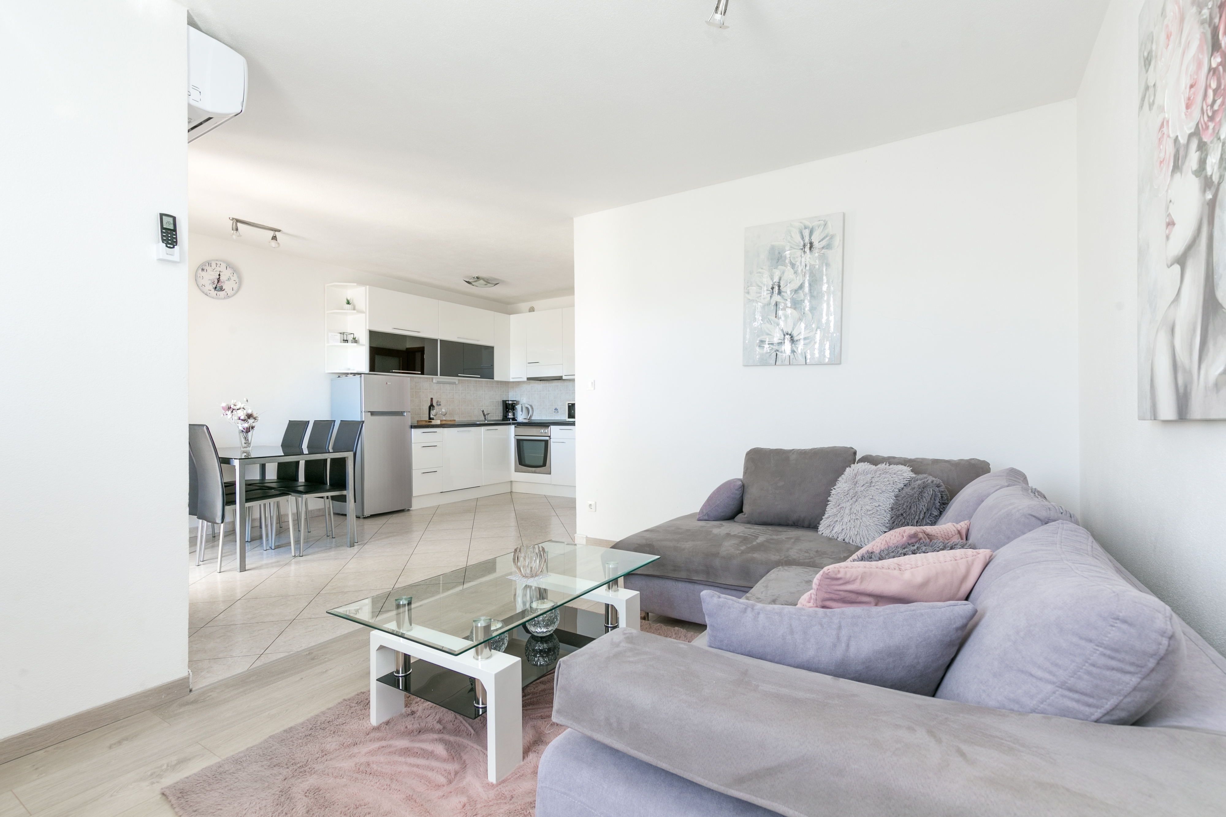 Apartment can accommodate 5 guests. Beds are situated in 2 sleeping rooms, but also in the living room, within 55m2. Guests can use a private terrace to enjoy the warm summer evenings. The apartment offers the sea view. Food can be prepared using barbecue which is shared with other guests too. Shared pool is on disposal during stay. INCLUDED IN THE PRICE: tourist tax, final cleaning, air-conditioning, pool, parking, internet, baby cot, iron, ironing board, hairdryer, sunshade, sunchairs. The availability of additional services for your chosen dates of stay, as well as their prices (if none are listed) must be checked ahead of time. Any additional services not shown in the price calculation are payable directly to the property owner and only if used by the visitor.