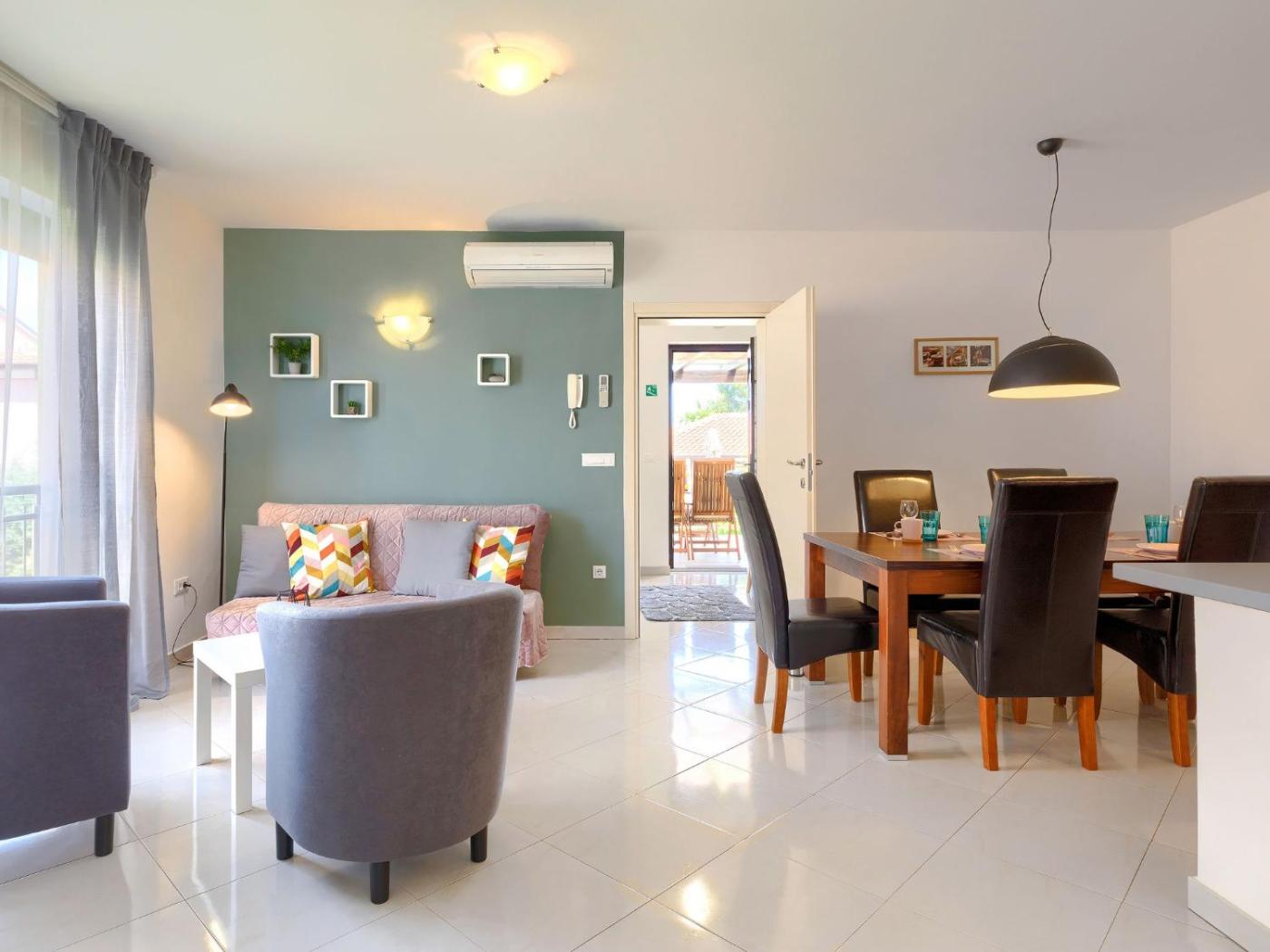 Apartment. Guests will have a special experience as the apartment offers a private pool. This spacious apartment consists of 1 living room, 2 separate bedrooms and 1 bathroom with a bath and a bidet. In the well-equipped kitchen, guests will find a stovetop, a refrigerator, a dishwasher and kitchenware. Featuring a terrace, this apartment also provides air conditioning, a dining area and a TV with satellite channels. The unit offers 3 beds.