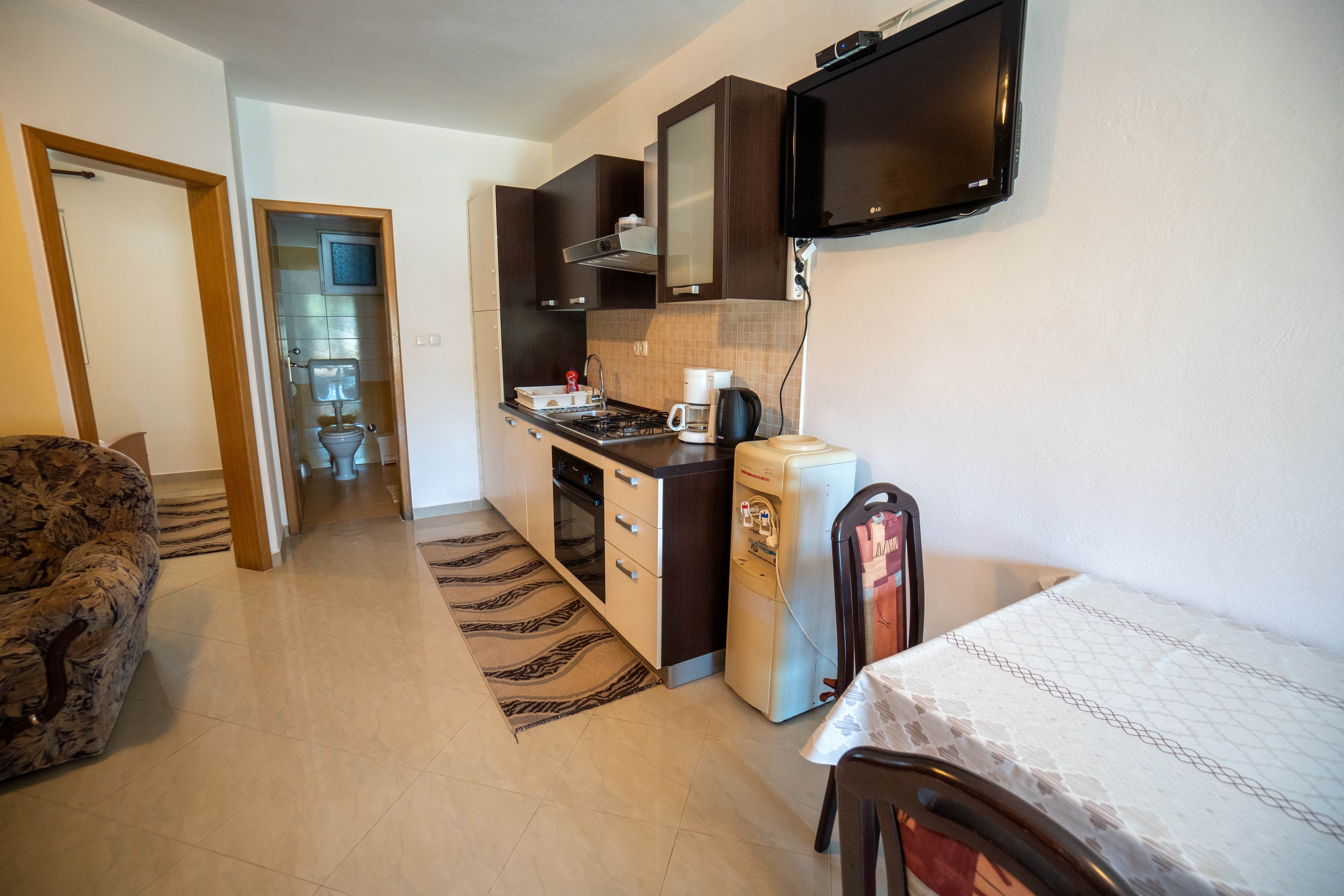 Apartment can accommodate 5 guests. Beds are situated in 2 sleeping rooms, but also in the living room, within 51m2. Guests can use a private terrace to enjoy the warm summer evenings. The apartment offers the sea view. Food can be prepared using barbecue which is shared with other guests too. INCLUDED IN THE PRICE: tourist tax, final cleaning, air-conditioning, parking, internet, baby cot, hairdryer, sunshade, sunchairs. OBLIGATORY ADDITIONAL COSTS: short stay fee (surcharge depending on a number of booked nights: 30% - 1, 20% - 2, 10% - 3). The availability of additional services for your chosen dates of stay, as well as their prices (if none are listed) must be checked ahead of time. Any additional services not shown in the price calculation are payable directly to the property owner and only if used by the visitor.